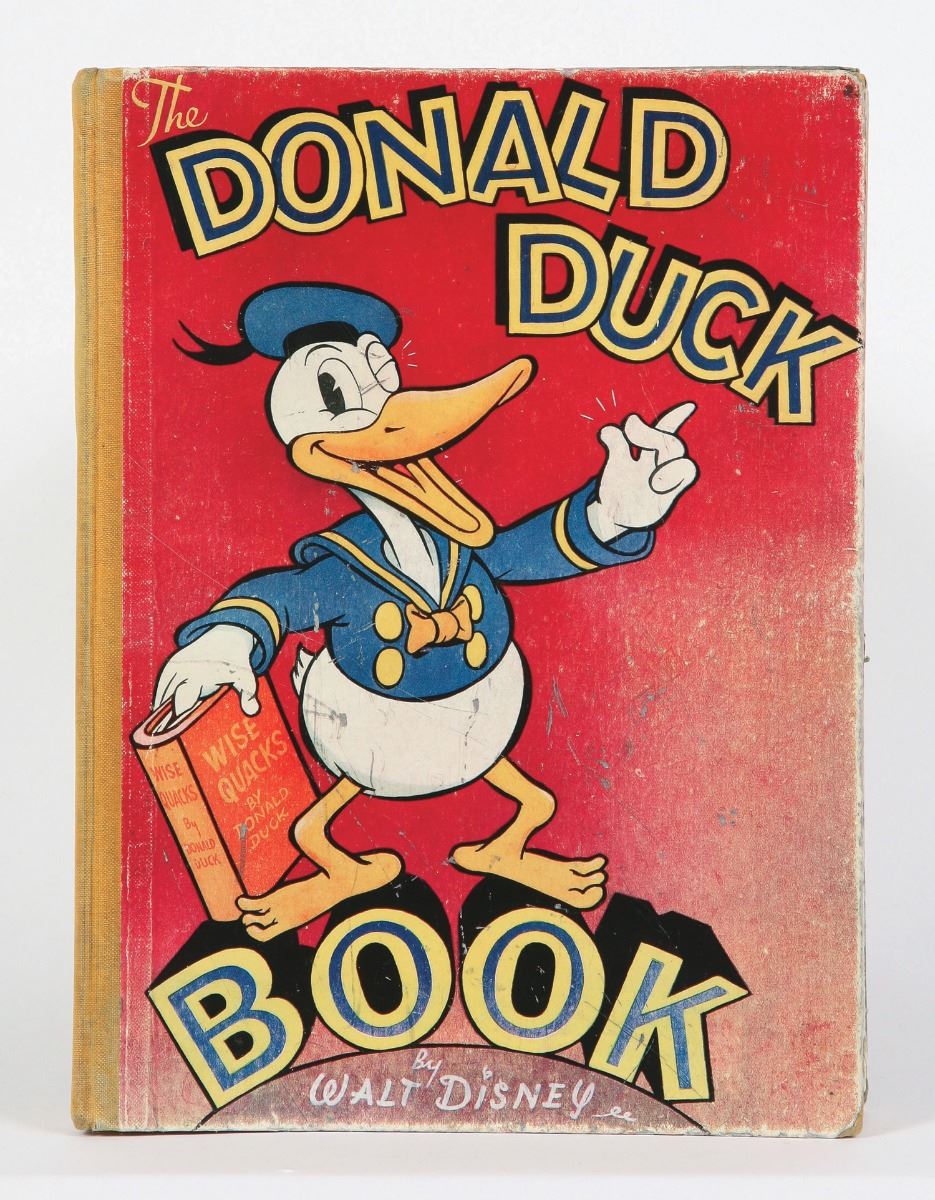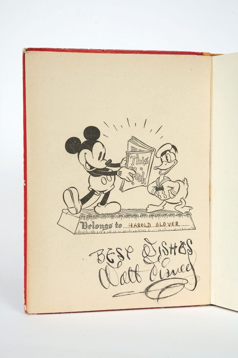 (Birn Brothers, 1937) This charming hardcover book titled "The Donald Duck Book by Walt Disney", features a colorful early depiction of Donald Duck on the cover. The presentation page is hand-signed by Walt Disney with the dedication, "Best Wishes". The original book owner's name is written in black pen on the same page. Measures 10"x7.4"x1". 90 pages. In fine condition with some fading along the front cover and minor spine wear.