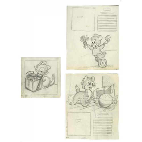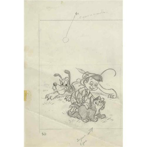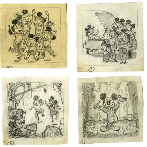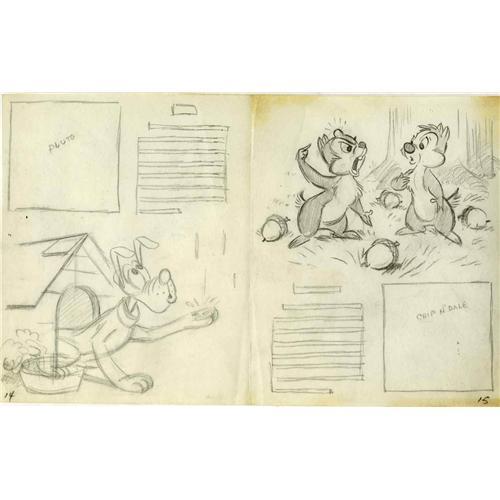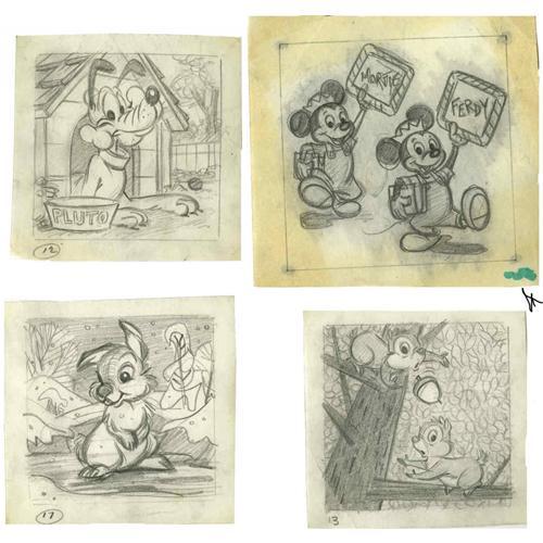 <B>Walt Disney Studio Artist - "Mickey Mouse Club Stamp Book" Preliminary Drawing Original Art, Group of 8 (Western, 1956).</B></I> Eight pencil preliminary layout drawings of the beloved Walt Disney cartoon characters are the focus of this lot. Drawn in pencil on vellum, the subjects include Timothy Mouse, Thumper (two scenes), Chip n' Dale, Morty and Ferdie, Pluto, and Figaro (two scenes). These preliminary pieces have image areas that range in size from 4" x 4" to 6.5" x 8", and the art is in Excellent condition. A copy of the <B>Mickey Mouse Club Stamp Book</B></I> is included in this lot.