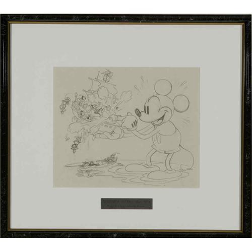 <B>Walt Disney Studios - "Gulliver Mickey" Preliminary Publicity Drawing Original Art (Disney, 1934).</B></I> Mickey Mouse lets his fingers do the talking, when the tiny citizens of Lilliput display force, in this pencil sketch from the legendary Disney short. This magnificent pencil sketch by Disney Studios artists, was as a preliminary for a publicity illustration used to promote the film. This is the only publicity pencil drawing believed to have survived from the early Disney Studio years. The art has an image area of 10" x 8" image area, and is in Excellent condition.