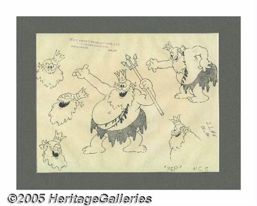 <B>Walt Disney Studios - King Neptune Model Sheet Original Art (circa 1932).</B></I> The King of the Sea becomes enraged when lustful pirates threaten violence and rapine against his innocent mermaids. Creatures of the deep rise to do Neptune's bidding and soon the pirate ship lies on the ocean floor. Peace and harmony are restored. This original pencil model sheet of King Neptune himself was produced for Walt Disney's fifth "Silly Symphony" cartoon short, "King Neptune," which was released on September 10. 1932. The Disney Studio was being distributed by United Artists, hence the film number "SS# 5 U.A." The art still has the original Hyperion Studio stamp on it. Drawn in graphite on two-holed Disney Studio animation paper, it measures 8.5" x 11," and is in Excellent condition.