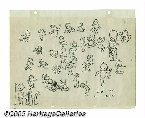<B>Walt Disney Studios - Lullaby Land Animation Model Sheet Original Art (circa 1933).</B></I> A baby falls asleep and dreams of a land where powder puffs and binkies grow on trees, and all the standard nursery paraphernalia comes vividly to life, in the Disney "Silly Symphony," "Lullaby Land," which was released on August 19, 1933. You'll go ga-ga over this delightful 8.5" x 12" model sheet, filled with lots of cute babies doing all sorts of infantile things. The animators were certainly inspired by this sweet study of roly-poly nurslings in motion. The art is drawn in pencil, and mounted onto a larger 9.5" x 12" board. Some aging is apparent, but overall the work is in Very Good condition.