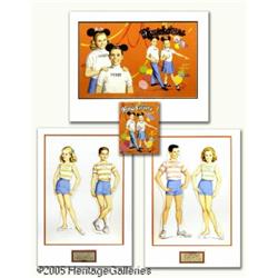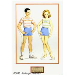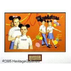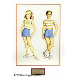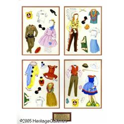 <B>Walt Disney Studios - Mickey Mouse Club Mouseketeers Cut Outs Original Art (Walt Disney Productions, 1963).</B></I> Mouseketeers, assemble! This lot is for you! And what a lot it is, starting with the original artwork for the cover of the <B>Mouseketeers Cut Outs</B></I> book featuring Cubby, Karen, Cheryl, and Bobby. Also included are six sparkling interior pages, the originals for all four of the Mouseketeer doll figures, and four of the six costume pages. The costume pages have been matted together for an overall presentation size of approximately 26" x 33.5", with each page measuring approximately 8.75" x 11.5". The doll pages, one with Bobby and Cheryl, and one with Cubby and Karen, each has an image area of approximately 12.5" x 19.75". All four attractively framed pieces are in Excellent condition and ready to be displayed. A copy of the cut out book, signed on the back by Bobby Burgess, is also included. Why? Because we <I>like</B></I> you!