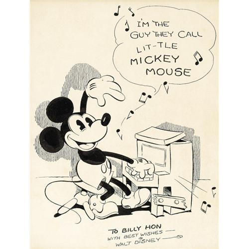 <B>Walt Disney Studios - Mickey Mouse Fan Card Illustration Original Art (Disney, circa 1930).</B></I> He's the guy they call "lit-tle" Mickey Mouse! This jazzy little illustration was created by the talented staff at Disney and features a vintage button-eyed Mickey tickling the ivories. The image area measures 8.25" x 10.75", and the art is spectacularly matted and framed. In Excellent condition. <I>From the Estate of Bruce Hamilton</B></I>. <BR><BR><B>Important notice:</B> Heritage usually auctions material at the rate of 200-250 lots per hour. On some occasions eBay Live bid software or the Internet may not be able to keep up with the pace of the auction. We recommend placing a realistic absentee bid now as insurance to avoid disappointment. Occasionally the auctioneer may eliminate or reject an eBay Live bid, and the auctioneer may also reopen a lot after the close of the eBay live bidding (usually because we missed an audience bid), and may reject your bid even if it shows you as the winning bidder. By bidding via eBay Live, you agree that Heritage may award the lot to another bidder at its sole discretion under the circumstances described above or any other reasonable circumstances. Since eBay bids are not shown to us until we open the lot on the floor, we treat those bids just like floor bids. In most cases the floor responds before the eBay bid is presented to us, due to Internet lag time, so for consistency we have made it a policy that floor bids are always considered first over tie eBay live bids. Also please note that all Heritage lots purchased through eBay Live carry a 22.5% Buyer's Premium. Please make sure you read the Terms and Conditions before you bid. This lot is being auctioned in conjunction with a live floor auction by Heritage Auction Galleries. All final auction and invoice information will be supplied by Heritage Auction Galleries, and all other information should be considered preliminary. Lot:41001 <BR><BR><B>Winning Notification and Billing:</B> After the FINAL session in this auction is complete, Heritage will send e-mail and snail mail invoices. This process normally takes several days. All final auction and invoice information will be supplied by Heritage Auction Galleries, and all other information should be considered preliminary. <BR><BR>This auction will be conducted on a live auction floor and over the Internet through eBay Live. If you choose to place an absentee bid, please take a moment to <font color='#0000ff'><u><a href='http://pages.ebay.com/liveauctions/help/before/laabsentee.html'>learn how eBay Live absentee bidding works</a></u></font><font color='#000000'>