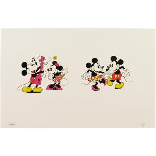 <B>Walt Disney Studios - "Mickey and Minnie" Promotion Illustration Original Art (Disney, undated).</B></I> Mickey and Minnie keep themselves entertained with a ukulele and some lively dancing in this snazzy illustration. The line work has been hand-inked onto acetate, and hand-painted on the back. The art has an image area measuring 14" x 5.5", and is in Excellent condition.<BR><BR><b>Shipping:</b> Flat Material, Small (<a target="_blank" href="http://www.heritageauctions.com/common/shipping.php">view shipping information</a>)