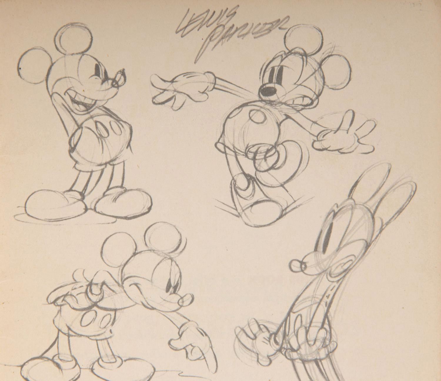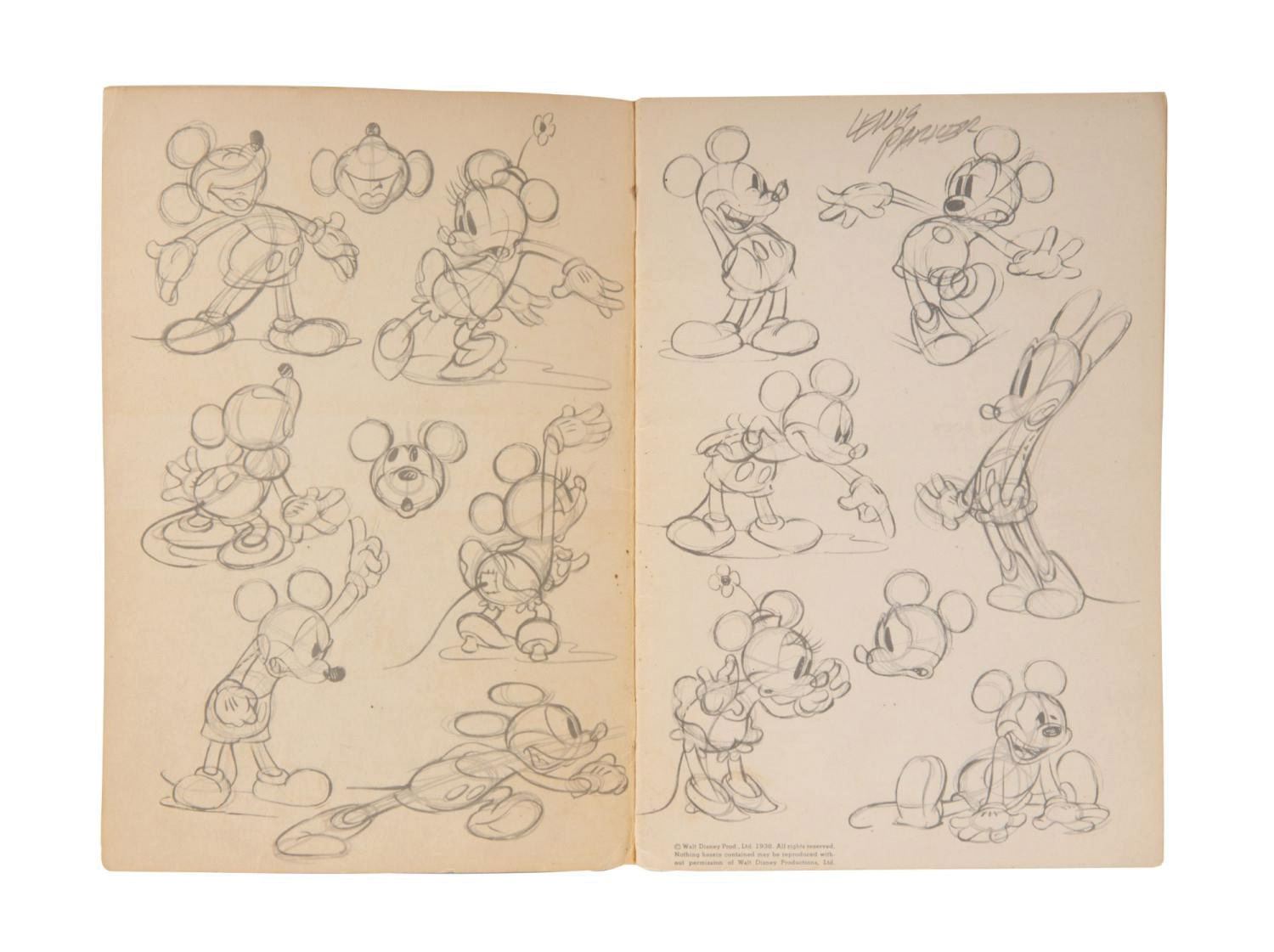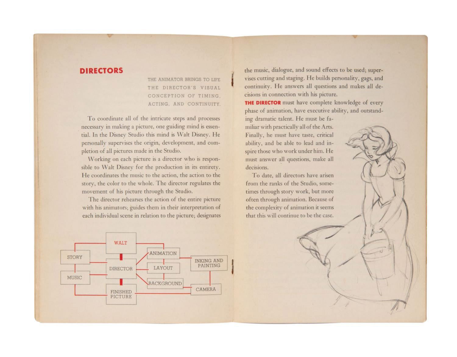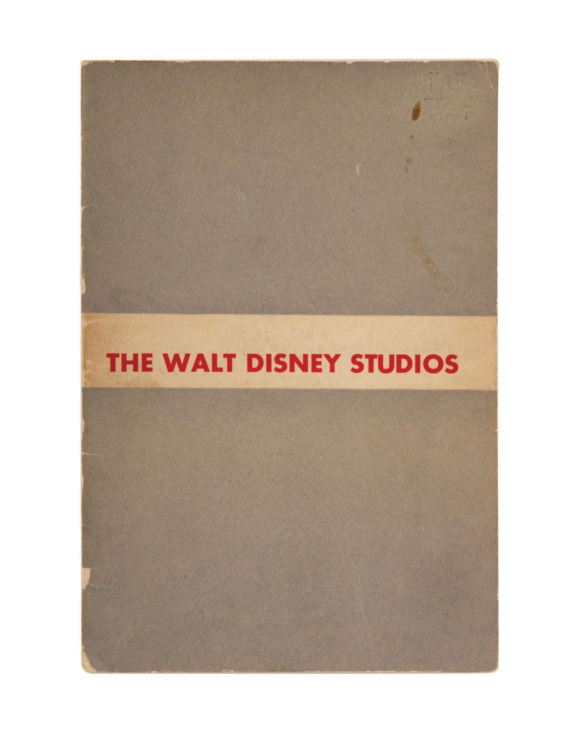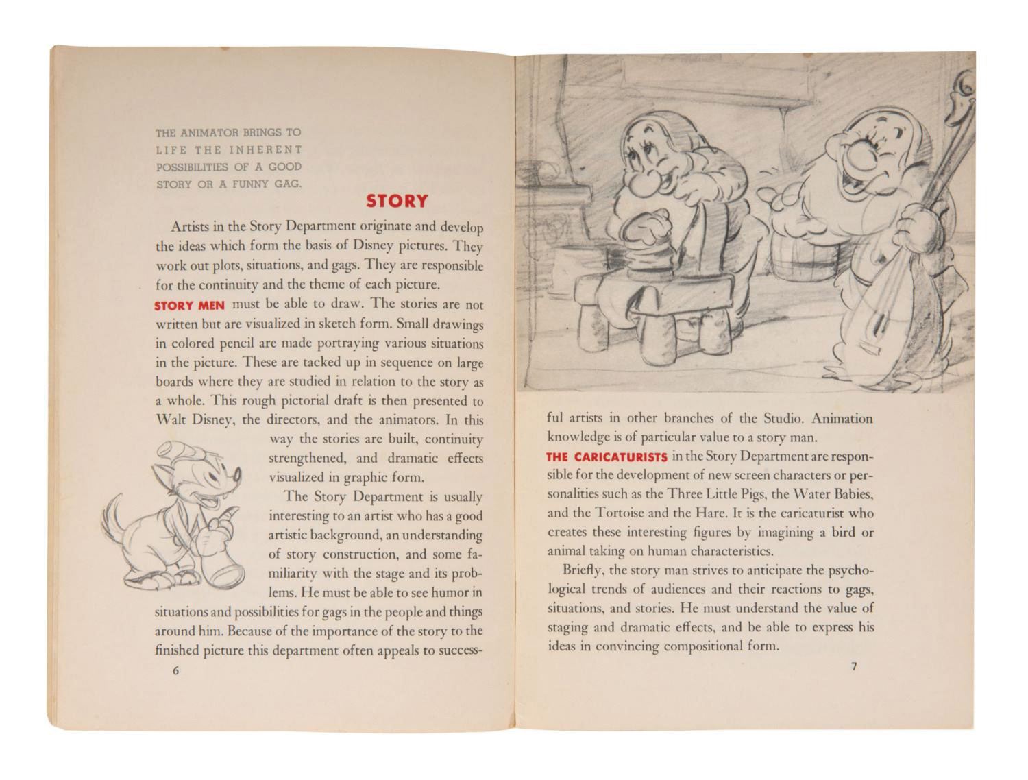 (Disney, 1938) A rare booklet created for new Walt Disney Studios employees. It served as "a brief outline of the Studio's principal departments and an explanation to artists of its employment policies." Black and white character roughs and illustrations from early Disney properties add a playful accent in each section. Measuring approximately 9"x6", the 31-page book is in very good condition, exhibiting minor spots of discoloration to the cover, as well as small creases and edge wear. The flyleaf is marked with the name Lewis Parker.