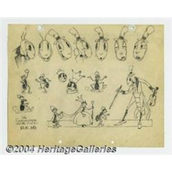 Walt Disney Studios - Original Animation Model Sheet for The Grasshopper and the Ants (undated). Released on February 10, 1934, Disney's "Silly Symphony," "The Grasshopper and the Ants" was the story of a grasshopper who fiddles and plays through his day, tempting some of the worker ants to play with him, unaware that winter is coming and food will soon be scarce. This model sheet was created by Disney artists as a guide for the animators, and features the Grasshopper and the Ants in various poses. The art is drawn on a 9.5" x 12" sheet of animation paper. Some aging is apparent, but overall the work is in great condition. Important notice: Heritage usually auctions material at the rate of 200-250 lots per hour. On some occasions eBay Live bid software or the Internet may not be able to keep up with the pace of the auction. We recommend placing a realistic absentee bid now as insurance to avoid disappointment. Occasionally the auctioneer may eliminate or reject an eBay Live bid, and the auctioneer may also reopen a lot after the close of the eBay live bidding (usually because we missed an audience bid), and may reject your bid even if it shows you as the winning bidder. By bidding via eBay Live, you agree that Heritage may award the lot to another bidder at its sole discretion under the circumstances described above or any other reasonable circumstances. Since eBay bids are not shown to us until we open the lot on the floor, we treat those bids just like floor bids. In most cases the floor responds before the eBay bid is presented to us, due to Internet lag time, so for consistency we have made it a policy that floor bids are always considered first over tie eBay live bids. Also please note that all Heritage lots purchased through eBay Live carry a 20% Buyer's Premium. Please make sure you read the Terms and Conditions before you bid.