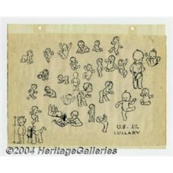 Walt Disney Studios - Original Animation Model Sheet for Lullaby Land (undated). A baby falls asleep and dreams of a land where powder puffs and binkies grow on trees, and all the standard nursery paraphernalia comes vividly to life, in the Disney "Silly Symphony," "Lullaby Land," which was released on August 19, 1933. You'll go ga-ga over this delightful 8.5" x 12" model sheet, filled with lots of cute babies doing all sorts of infantile things. The animators were certainly inspired by this sweet study of roly poly nurslings in motion. The art is drawn in pencil, and mounted onto a larger 9.5" x 12" board. Some aging is apparent, but overall the work is in great condition. Important notice: Heritage usually auctions material at the rate of 200-250 lots per hour. On some occasions eBay Live bid software or the Internet may not be able to keep up with the pace of the auction. We recommend placing a realistic absentee bid now as insurance to avoid disappointment. Occasionally the auctioneer may eliminate or reject an eBay Live bid, and the auctioneer may also reopen a lot after the close of the eBay live bidding (usually because we missed an audience bid), and may reject your bid even if it shows you as the winning bidder. By bidding via eBay Live, you agree that Heritage may award the lot to another bidder at its sole discretion under the circumstances described above or any other reasonable circumstances. Since eBay bids are not shown to us until we open the lot on the floor, we treat those bids just like floor bids. In most cases the floor responds before the eBay bid is presented to us, due to Internet lag time, so for consistency we have made it a policy that floor bids are always considered first over tie eBay live bids. Also please note that all Heritage lots purchased through eBay Live carry a 20% Buyer's Premium. Please make sure you read the Terms and Conditions before you bid.