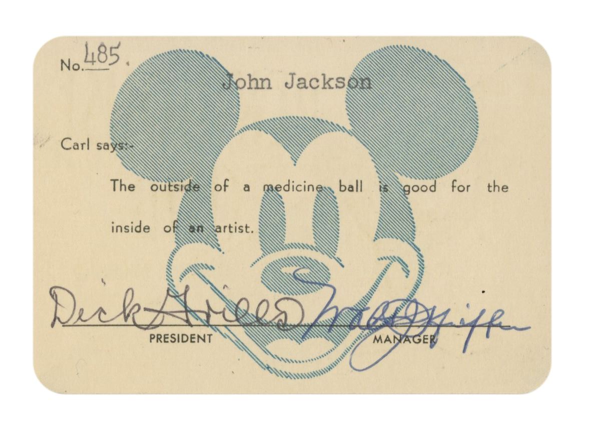 (Disney, 1956) An extremely rare membership card from the Walt Disney Studios private Penthouse Club. Items from this exclusive athletic club for male members of the Walt Disney Studios are very scarce. Rolly spent much of his free time at the club gym. This card was issued to John Jackson for 1956. The card is signed by Jackson on the front, and by the Penthouse Club President as well as the Manager Walt Pfeifer on the reverse. The back of the card is numbered 485 and has the slogan, "Carl says- The outside of a medicine ball is good for the inside of an artist", referring to the Penthouse Club's trainer and former Olympian, Karl Johnson. This card measures approximately 2.5"x3.5" and is in very good condition with little wear.