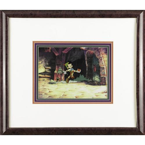 <B>Walt Disney Studios - "Pinocchio" Production Cel Original Art (Disney, 1940).</B></I> Disney's "Pinocchio" remains one of the most endearing, magical, musical classics ever to grace the silver screen. Carlo Collodi's famous wooden boy skips along on his way to school, in this hand inked and hand painted production cel, on a photocopy background. The image area measures 9.5" x 7". Matted and framed and in Excellent condition. <BR><BR><B>Important notice:</B> Heritage usually auctions material at the rate of 200-250 lots per hour. On some occasions eBay Live bid software or the Internet may not be able to keep up with the pace of the auction. We recommend placing a realistic absentee bid now as insurance to avoid disappointment. Occasionally the auctioneer may eliminate or reject an eBay Live bid, and the auctioneer may also reopen a lot after the close of the eBay live bidding (usually because we missed an audience bid), and may reject your bid even if it shows you as the winning bidder. By bidding via eBay Live, you agree that Heritage may award the lot to another bidder at its sole discretion under the circumstances described above or any other reasonable circumstances. Since eBay bids are not shown to us until we open the lot on the floor, we treat those bids just like floor bids. In most cases the floor responds before the eBay bid is presented to us, due to Internet lag time, so for consistency we have made it a policy that floor bids are always considered first over tie eBay live bids. Also please note that all Heritage lots purchased through eBay Live carry a 22.5% Buyer's Premium. Please make sure you read the Terms and Conditions before you bid. This lot is being auctioned in conjunction with a live floor auction by Heritage Auction Galleries. All final auction and invoice information will be supplied by Heritage Auction Galleries, and all other information should be considered preliminary. Lot:41001 <BR><BR><B>Winning Notification and Billing:</B> After the FINAL session in this auction is complete, Heritage will send e-mail and snail mail invoices. This process normally takes several days. All final auction and invoice information will be supplied by Heritage Auction Galleries, and all other information should be considered preliminary. <BR><BR>This auction will be conducted on a live auction floor and over the Internet through eBay Live. If you choose to place an absentee bid, please take a moment to <font color='#0000ff'><u><a href='http://pages.ebay.com/liveauctions/help/before/laabsentee.html'>learn how eBay Live absentee bidding works</a></u></font><font color='#000000'>