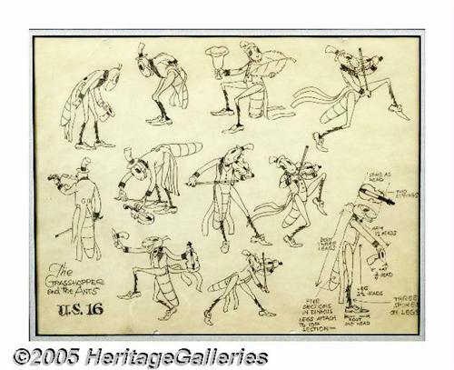 <B>Walt Disney Studios - The Grasshopper and the Ants Model Sheet Original Art (circa 1934).</B></I> Released on February 10, 1934, Disney's "Silly Symphony," "The Grasshopper and the Ants" was the story of a grasshopper who fiddles and plays through his day, tempting some of the worker ants to play with him, unaware that winter is coming and food will soon be scarce. This model sheet was created by Disney artists as a guide for the animators, and features the Grasshopper in various poses. The art is drawn on a 8.5" x 11" sheet of animation paper. Some aging is apparent, but overall the work is in Excellent condition. Hop to it and get your bid in now!