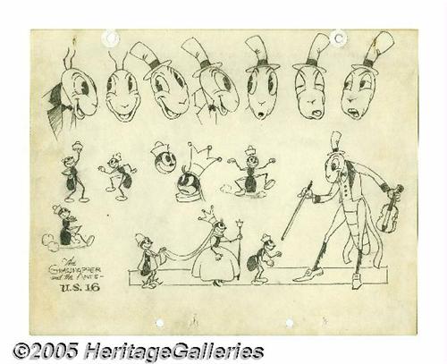 <B>Walt Disney Studios - The Grasshopper and the Ants Animation Model Sheet Original Art (circa 1934).</B></I> Released on February 10, 1934, Disney's "Silly Symphony," "The Grasshopper and the Ants" was the story of a grasshopper who fiddles and plays through his day, tempting some of the worker ants to play with him, unaware that winter is coming and food will soon be scarce. This model sheet was created by Disney artists as a guide for the animators, and features the Grasshopper and the Ants in various poses. The art is drawn on a 9.5" x 12" sheet of animation paper. Some aging is apparent, but overall the work is in Very Good condition.