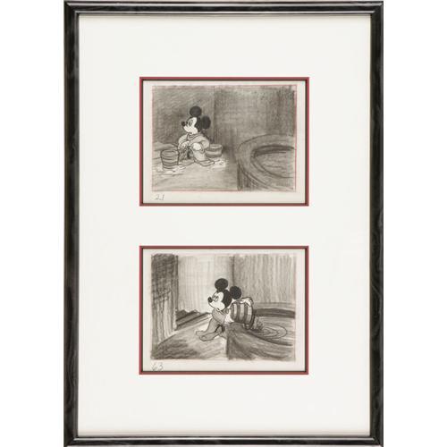 <B>Walt Disney Studios - "The Sorcerer's Apprentice" Storyboard Drawing Original Art, Group of 2 (Disney, 1940).</B></I> Here are two dynamic storyboard sketches of Mickey Mouse dressed as the Sorcerer's Apprentice, from his most famous role in the most famous sequence of Disney's masterpiece, "Fantasia." These two classic Mickey storyboard frames are rendered in graphite, each with an image area of approximately 6" x 4.5". Matted and framed, and in Excellent condition. <BR><BR><B>Important notice:</B> Heritage usually auctions material at the rate of 200-250 lots per hour. On some occasions eBay Live bid software or the Internet may not be able to keep up with the pace of the auction. We recommend placing a realistic absentee bid now as insurance to avoid disappointment. Occasionally the auctioneer may eliminate or reject an eBay Live bid, and the auctioneer may also reopen a lot after the close of the eBay live bidding (usually because we missed an audience bid), and may reject your bid even if it shows you as the winning bidder. By bidding via eBay Live, you agree that Heritage may award the lot to another bidder at its sole discretion under the circumstances described above or any other reasonable circumstances. Since eBay bids are not shown to us until we open the lot on the floor, we treat those bids just like floor bids. In most cases the floor responds before the eBay bid is presented to us, due to Internet lag time, so for consistency we have made it a policy that floor bids are always considered first over tie eBay live bids. Also please note that all Heritage lots purchased through eBay Live carry a 22.5% Buyer's Premium. Please make sure you read the Terms and Conditions before you bid. This lot is being auctioned in conjunction with a live floor auction by Heritage Auction Galleries. All final auction and invoice information will be supplied by Heritage Auction Galleries, and all other information should be considered preliminary. Lot:41001 <BR><BR><B>Winning Notification and Billing:</B> After the FINAL session in this auction is complete, Heritage will send e-mail and snail mail invoices. This process normally takes several days. All final auction and invoice information will be supplied by Heritage Auction Galleries, and all other information should be considered preliminary. <BR><BR>This auction will be conducted on a live auction floor and over the Internet through eBay Live. If you choose to place an absentee bid, please take a moment to <font color='#0000ff'><u><a href='http://pages.ebay.com/liveauctions/help/before/laabsentee.html'>learn how eBay Live absentee bidding works</a></u></font><font color='#000000'>