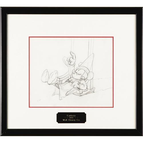 <B>Walt Disney Studios - "The Sorcerer's Apprentice" Animation Production Drawing Original Art (Disney, 1940).</B></I> Brash, young wizard wannabe, Mickey, sits back in the Wizard's chair, orchestrating the movements of an enchanted broom, and soon falls asleep with dreams of power, in this entrancing drawing from "Fantasia." Rendered in graphite, this cute and cocky drawing of Mickey has an image area measuring 10.5" x 8.5". Matted and framed, and in Excellent condition. <BR><BR><B>Important notice:</B> Heritage usually auctions material at the rate of 200-250 lots per hour. On some occasions eBay Live bid software or the Internet may not be able to keep up with the pace of the auction. We recommend placing a realistic absentee bid now as insurance to avoid disappointment. Occasionally the auctioneer may eliminate or reject an eBay Live bid, and the auctioneer may also reopen a lot after the close of the eBay live bidding (usually because we missed an audience bid), and may reject your bid even if it shows you as the winning bidder. By bidding via eBay Live, you agree that Heritage may award the lot to another bidder at its sole discretion under the circumstances described above or any other reasonable circumstances. Since eBay bids are not shown to us until we open the lot on the floor, we treat those bids just like floor bids. In most cases the floor responds before the eBay bid is presented to us, due to Internet lag time, so for consistency we have made it a policy that floor bids are always considered first over tie eBay live bids. Also please note that all Heritage lots purchased through eBay Live carry a 22.5% Buyer's Premium. Please make sure you read the Terms and Conditions before you bid. This lot is being auctioned in conjunction with a live floor auction by Heritage Auction Galleries. All final auction and invoice information will be supplied by Heritage Auction Galleries, and all other information should be considered preliminary. Lot:41001 <BR><BR><B>Winning Notification and Billing:</B> After the FINAL session in this auction is complete, Heritage will send e-mail and snail mail invoices. This process normally takes several days. All final auction and invoice information will be supplied by Heritage Auction Galleries, and all other information should be considered preliminary. <BR><BR>This auction will be conducted on a live auction floor and over the Internet through eBay Live. If you choose to place an absentee bid, please take a moment to <font color='#0000ff'><u><a href='http://pages.ebay.com/liveauctions/help/before/laabsentee.html'>learn how eBay Live absentee bidding works</a></u></font><font color='#000000'>