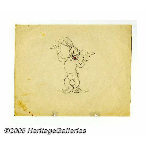 <B>Walt Disney Studios - The Tortoise and the Hare Animation Drawing Original Art (Disney, 1934).</B></I> Directed by Wilfred Jackson, this Silly Symphony, ""The Tortoise and the Hare,"" won an Academy Award for Best Cartoon. In his belief that he can win the race no matter what, overconfident Max Hare spends his time entertaining the female rabbits, while persistent Toby Tortoise comes from behind and wins the race. Here is a zippy animation drawing in graphite of Max Hare, drawn on a sheet of 9"" x 11"" animation bond paper. Aside from some overall aging, and some light staining along the left edge, this work is in Very Good condition. <BR><BR><B>Important notice:</B> Heritage usually auctions material at the rate of 200-250 lots per hour. On some occasions eBay Live bid software or the Internet may not be able to keep up with the pace of the auction. We recommend placing a realistic absentee bid now as insurance to avoid disappointment. Occasionally the auctioneer may eliminate or reject an eBay Live bid, and the auctioneer may also reopen a lot after the close of the eBay live bidding (usually because we missed an audience bid), and may reject your bid even if it shows you as the winning bidder. By bidding via eBay Live, you agree that Heritage may award the lot to another bidder at its sole discretion under the circumstances described above or any other reasonable circumstances. Since eBay bids are not shown to us until we open the lot on the floor, we treat those bids just like floor bids. In most cases the floor responds before the eBay bid is presented to us, due to Internet lag time, so for consistency we have made it a policy that floor bids are always considered first over tie eBay live bids. Also please note that all Heritage lots purchased through eBay Live carry a 20% Buyer's Premium. Please make sure you read the Terms and Conditions before you bid. This lot is being auctioned in conjunction with a live floor auction by Heritage Galleries & Auctioneer
