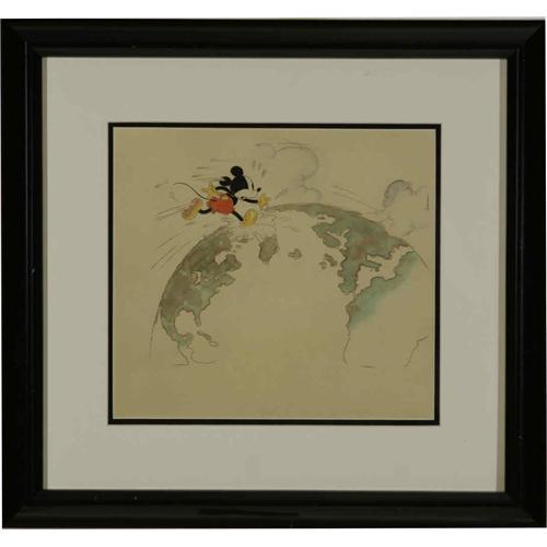 <B>Walt Disney Studios - "Through the Mirror" Concept Painting Original Art (Disney, 1936).</B></I> Go East, young mouse! This exquisitely rendered pencil and watercolor painting pictures Mickey in the act of racing around the globe. His panicked expression, coupled with the exaggerated movement lines and sweatdrops would indicate that Mickey's easterly trek is for the sole purpose of not falling off the earth! This painted work is in a pristine state of preservation, handsomely double matted, and incredibly appealing. Little production work survives from this great short. Only a few cels are known to exist and none of them are considered to be exceptional examples. This desirable piece has a 9.5" x 10.5" image area, and is in Excellent condition.