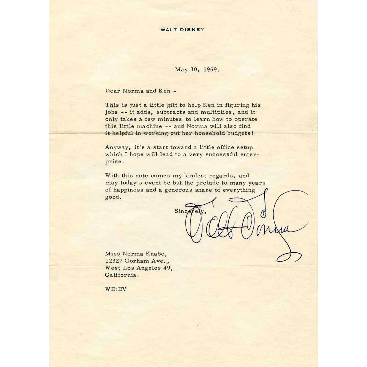 Very rare Walt Disney typed letter signed upon his personal stationery. Dated 30 May 1959 and addressed to a Norma Knabe, letter reads in part, ''...Dear Norma and Ken - This is just a little gift to help Ken in figuring his jobs -- it adds, subtracts and multiplies, and it only takes a few minutes to learn how to operate this little machine...Sincerely, Walt Disney.'' Letter measures 7.25'' x 10''. In very good condition with usual folds and a barely perceptible trimmed lower edge. Signature in ball-point ink is quite large and dark.