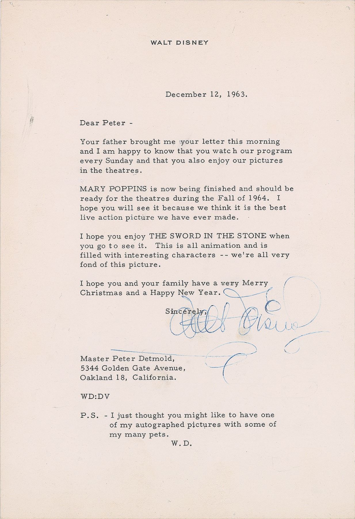 TLS, one page, 7.25 x 10.5, personal letterhead, December 12, 1963. Letter to Peter Detmold, in full: "Your father brought me your letter this morning and I am happy to know that you watch our program every Sunday and that you also enjoy our pictures in the theatres. Mary Poppins is now being finished and should be ready for the theatres during the Fall of 1964. I hope you will see it because we think it is the best live action picture we have ever made. I hope you enjoy The Sword in the Stone when you go to see it. This is all animation and is filled with interesting characters—we're all very fond of this picture. I hope you and your family have a very Merry Christmas and Happy New Year." In fine condition. Accompanied by the original Walt Disney Productions mailing envelope.