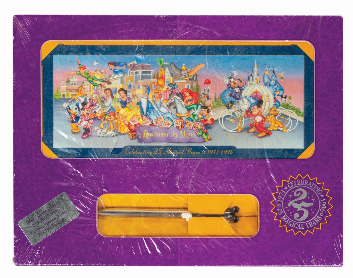 (Walt Disney World, 1996) A commemorative ticket boxed set celebrating Walt Disney World's 25th anniversary. The set additionally includes a Mickey Mouse ballpoint pen. Featuring over 30 popular Disney characters with a backdrop of familiar Walt Disney World landmarks, the commemorative ticket can still be used for a single day admission ticket today as it has no expiration date. Measuring approximately 4"x9" in its 9"x11.5" and 1.25" deep box, the set is in very good condition and is still shrink-wrapped in its original packaging. There is some surface wear to the shrink-wrap, including some tearing and scratching, but it appears that this has caused only minor wear to the box.