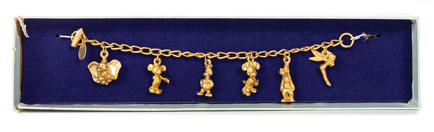 (Walt Disney World, c.1980s) A souvenir charm bracelet from Walt Disney World. The (6) gold-tone charms feature Dumbo, Mickey Mouse, Donald Duck, Minnie Mouse, Goofy, and Tinker Bell. The bracelet is still in its original box with the silver foil "Walt Disney World" name on the front and original price sticker on the back. Measuring 5.5" long, the bracelet is in very good condition and the box is in fair condition with wear throughout the edges and plastic lid.