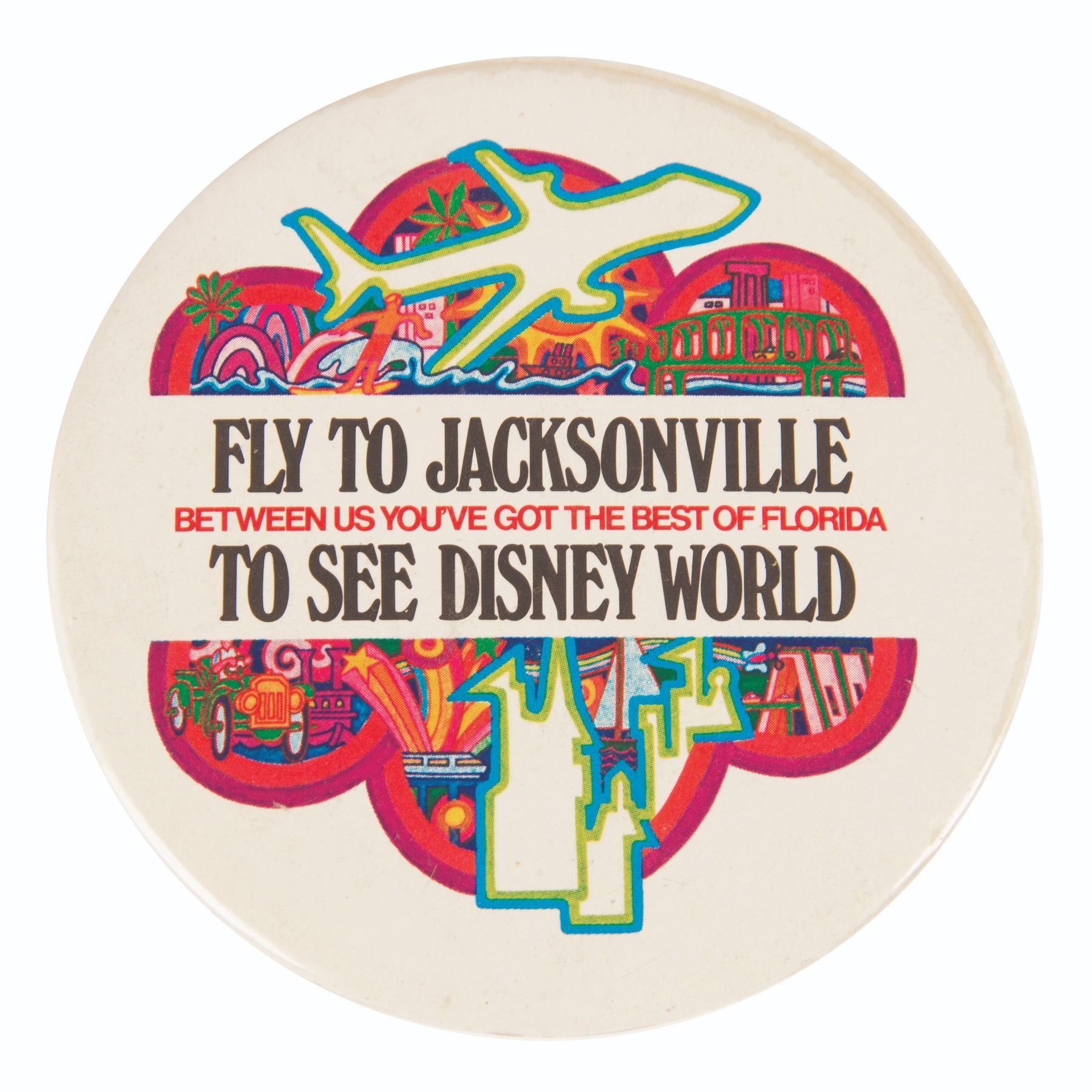 (Walt Disney World, c.1970s) An airline promo button featuring stylish 1970s artwork of the attractions at the newly opened Walt Disney World. The button reads, "Fly To Jacksonville to See Disney World" and measures 4" in diameter. The condition is good with some wear to the edge from use.