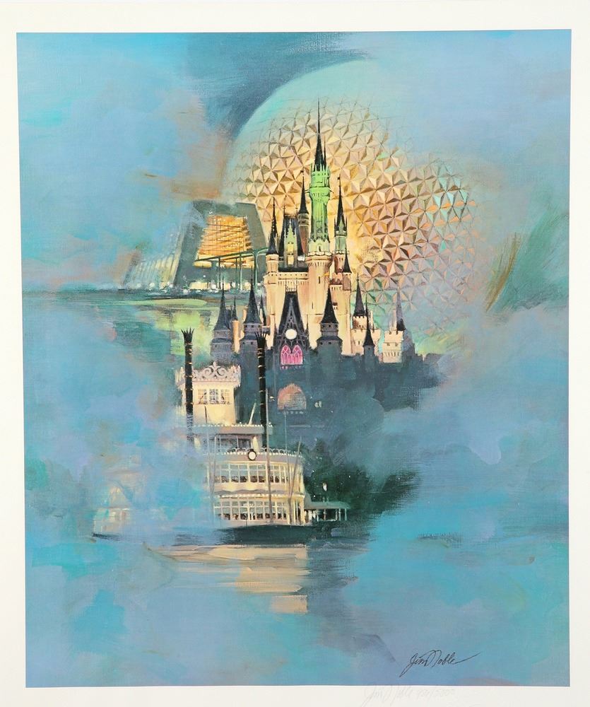 (Walt Disney World, 1986) A rare cast member exclusive poster made for the 15th Anniversary of WDW. The poster is signed by the artist Jim Noble and is numbered 986/5000. Measures 28"x21.75". In fine condition with some edge-wear.