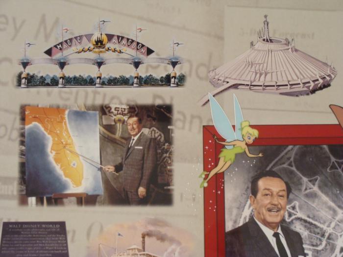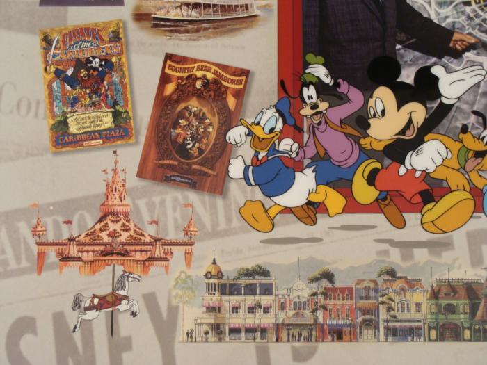 This piece highlights various Disney theme park scenes, including those from the Pirates of the Caribbean, Main Street U.S.A., the Haunted Mansion, Country Bears Jamboree, Epcot, Small World After All, Monorail, and more. It is like a tour through Walt's dream theme park.