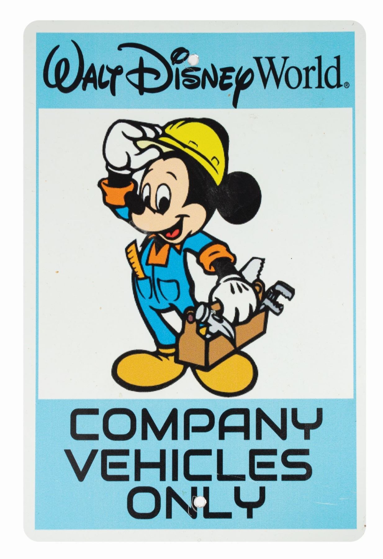 (Walt Disney World, c.1990s) An original parking sign from Walt Disney World that was used to designate spaces for company vehicles. Featuring a great image of workman Mickey Mouse, the metal sign measures 18"x12" and has two holes used for mounting the sign. The condition is good overall with some surface scratches from use.
