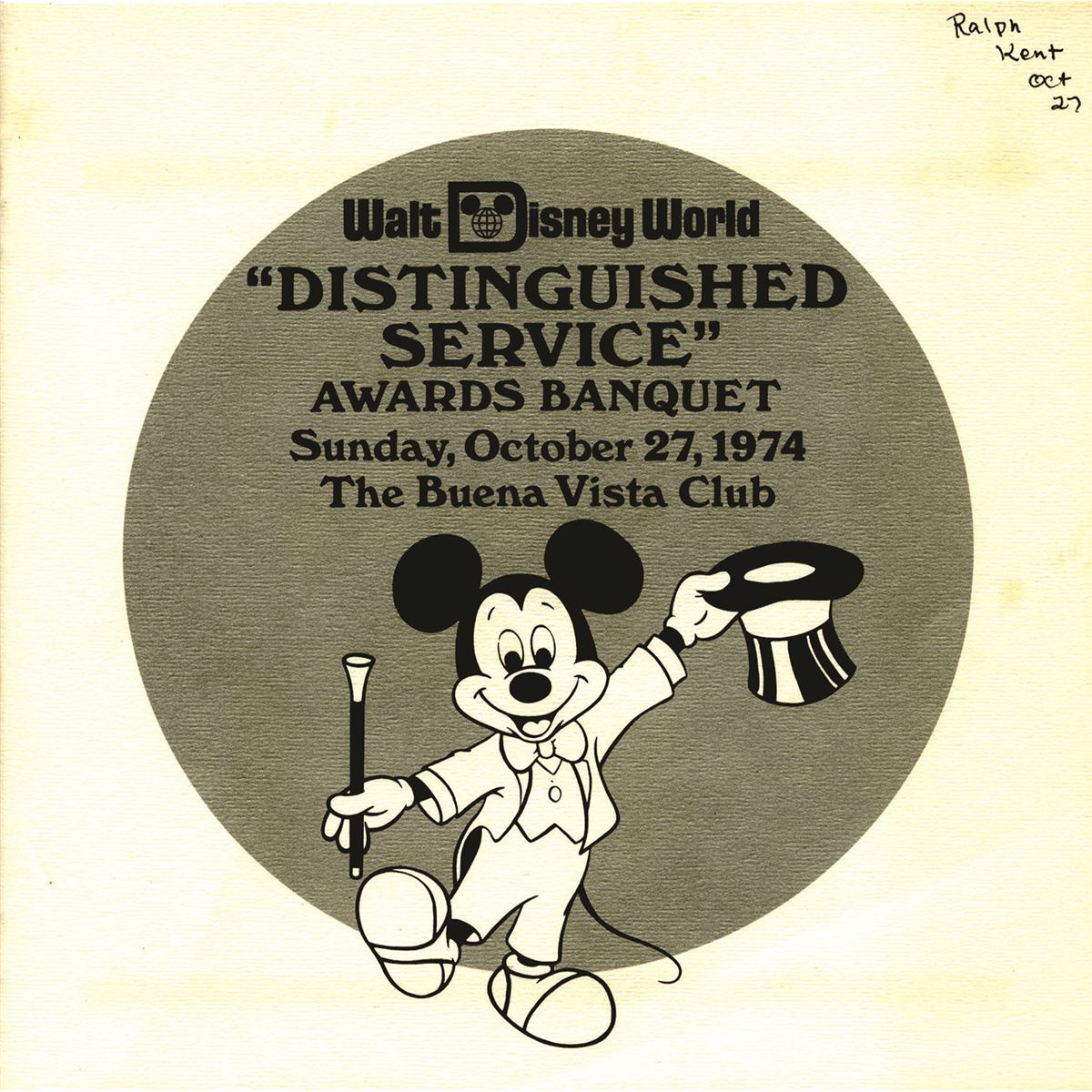 (Walt Disney World, 1974) Rare in-house program for a distinguished service awards banquet held at Walt Disney World in 1974. This particular program was Imagineer Ralph Kent’s copy as he received his 10 year service award at this event. The program measures 8”x8”. In good condition with minimal wear and staining.