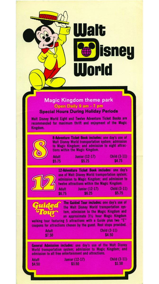 (Walt Disney World, 1973) Nice early gate card featuring park hours and ticket prices for Walt