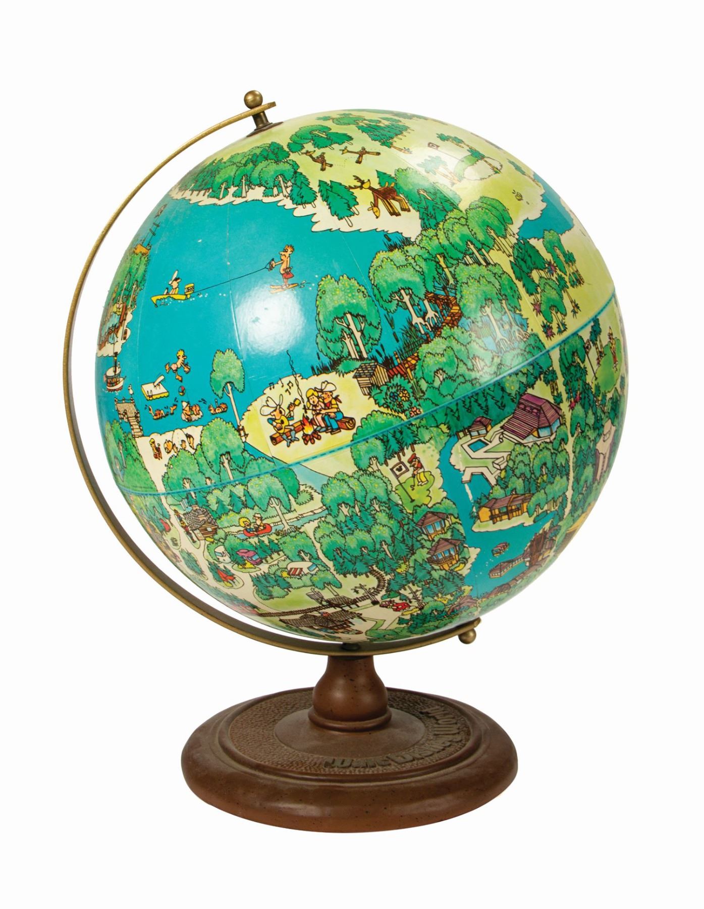(Walt Disney World, 1971) An extremely rare globe featuring an early stylized park map of the Walt Disney World Resort. This globe is believed to have been used at travel agencies to promote travel to the new Disney resort, and surviving examples are exceptionally hard to find. The lightweight globe has a wooden base marked with the name "Walt Disney World," and measures approximately 12" in diameter and 16" tall, not including the arm. The condition is very good with minor surface wear including a few small worn areas of the printed imagery.