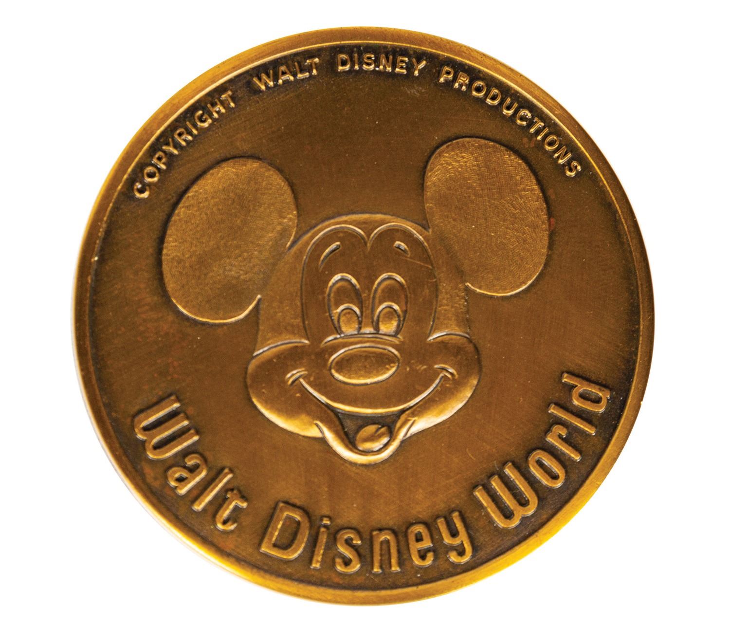 (Walt Disney World, 1971) A metal medallion given as a VIP gift to commemorate the grand opening of Walt Disney World. The medallion is etched along the edge with the number 1089, and depicts Mickey on one side, with raised imagery of Walt Disney World Resort on the other. Measuring 2.5" in diameter, the medallion is in very good condition with minor surface wear and some tarnishing along the edge.