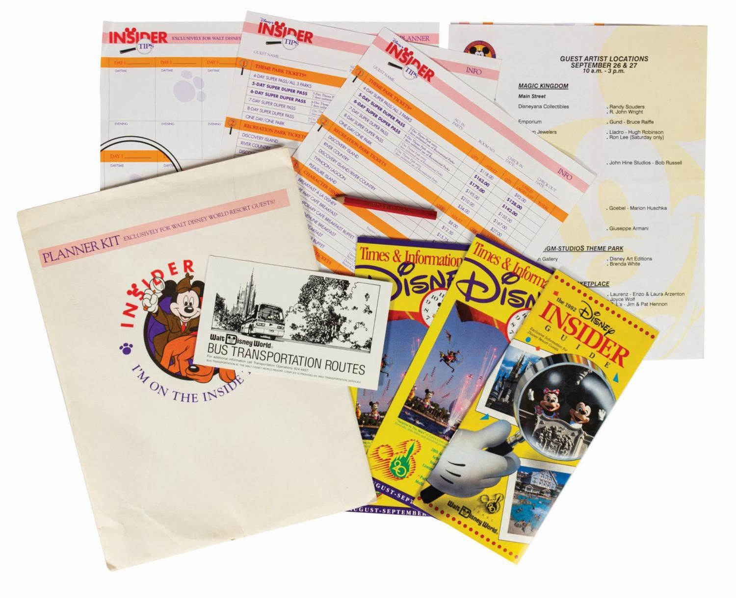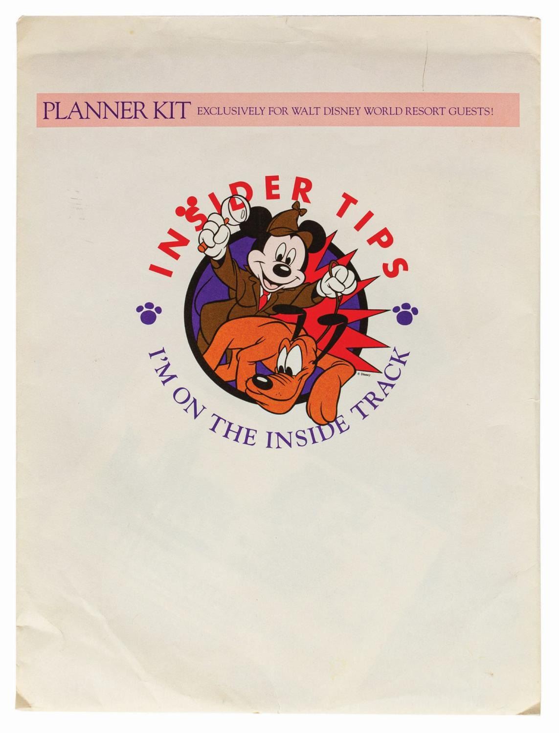 (Walt Disney World, 1992) A vintage Walt Disney World Insider Planner Kit exclusively available to guests of the resort. The kit includes the 31-page Disney Insider Guide, (2) Times & Information brochures, Bus Transportation Routes timetable, (2) Insider Tips advance ticket order forms, (2) blank weekly calendars for vacation planning, a golf pencil, and a Guest Artist Locations guide. All items are housed in the original Insider Tips Planner Kit envelope depicting Mickey as a detective with Pluto. The envelope measures 9"x12" and is in good condition with minor soiling, edge wear, and surface stress lines. The contents are all in very good to fine condition with some corner bending.