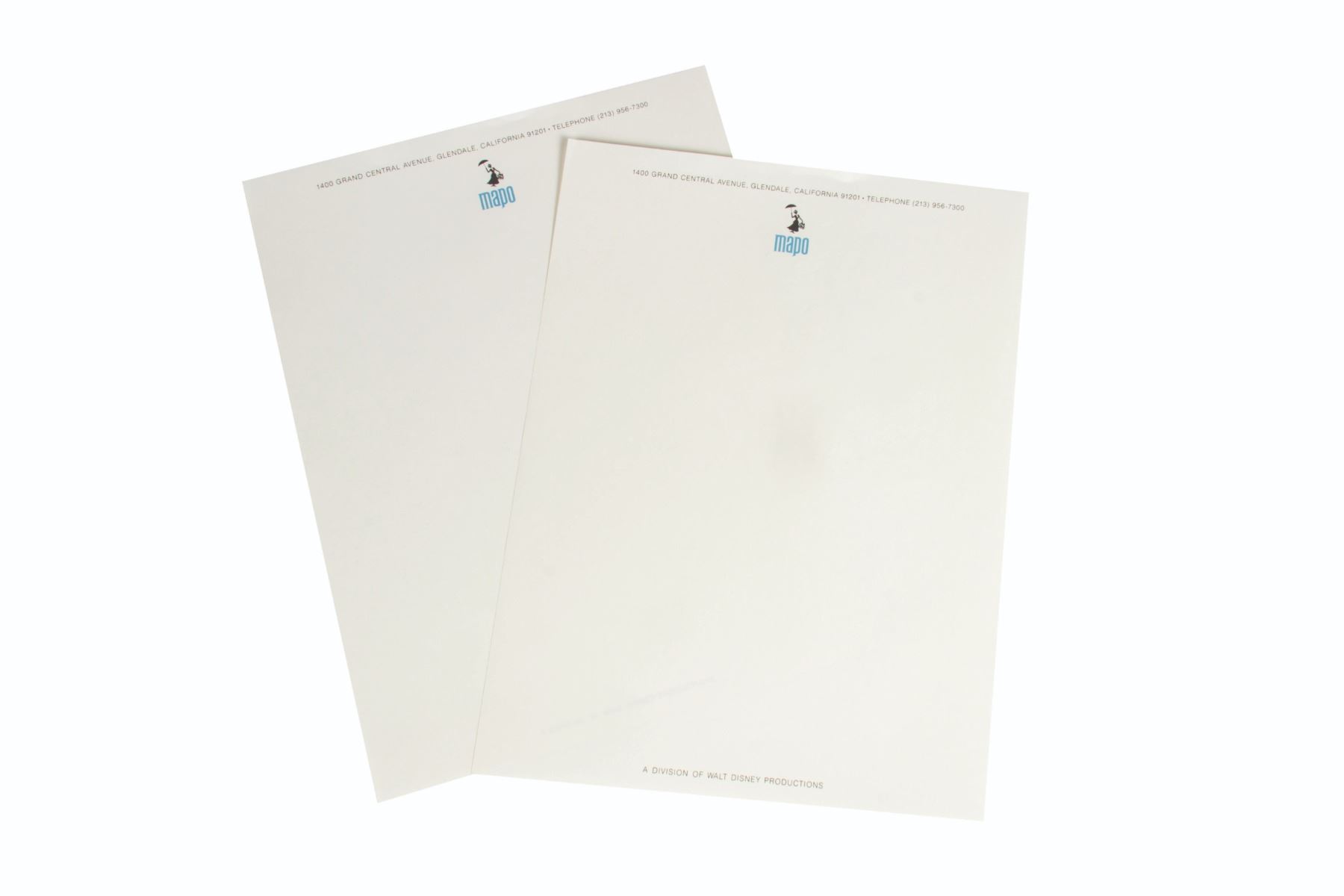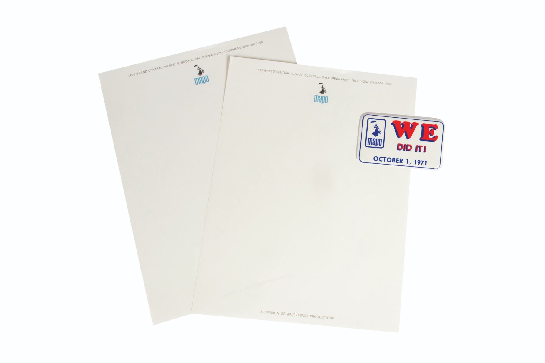 (Walt Disney World, c.1971) A very rare "We Did It!" pin and (2) sheets of official MAPO letterhead. The items feature the MAPO company logo depicting Mary Poppins, and the pin was made for the grand opening of Walt Disney World on Oct 1, 1971. The pin measures 1.75"x2.75" and the letterhead measures 11"x8.5". The set is in very good condition overall with some paper residue on the reverse of the pin.