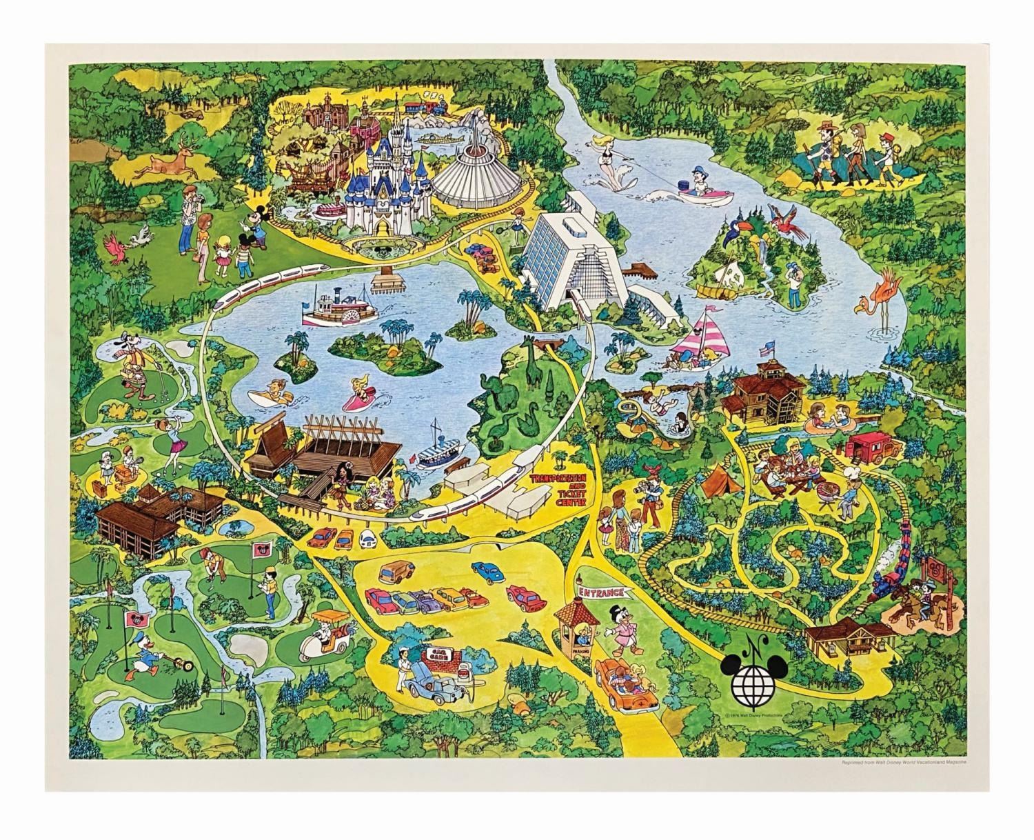 (Walt Disney World, 1976) A vintage illustrated map of the Magic Kingdom at Walt Disneyworld. The whimsical, stylized illustration first appeared in the Spring 1975 issue of Walt Disney World Vacationland Magazine, and was so popular that a standalone print was created. Measuring 21"x25", the piece is in very good condition with minor wear to the bottom left corner.