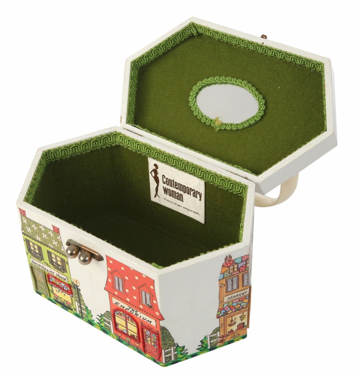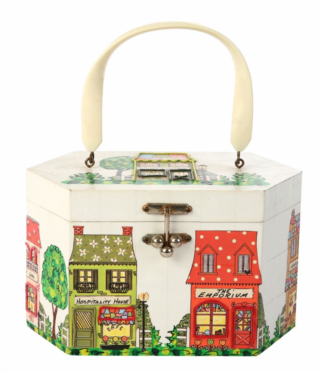 (Walt Disney World, 1970s) Souvenir wooden handbag featuring WDW's Main Street imagery on the outside. Hand-painted with collage elements. Manufactured by Glorybee of Orlando, FL. Measures 5.25"x9" and 5.5" tall. In good condition with minor wear and some corrosion to the clasp.