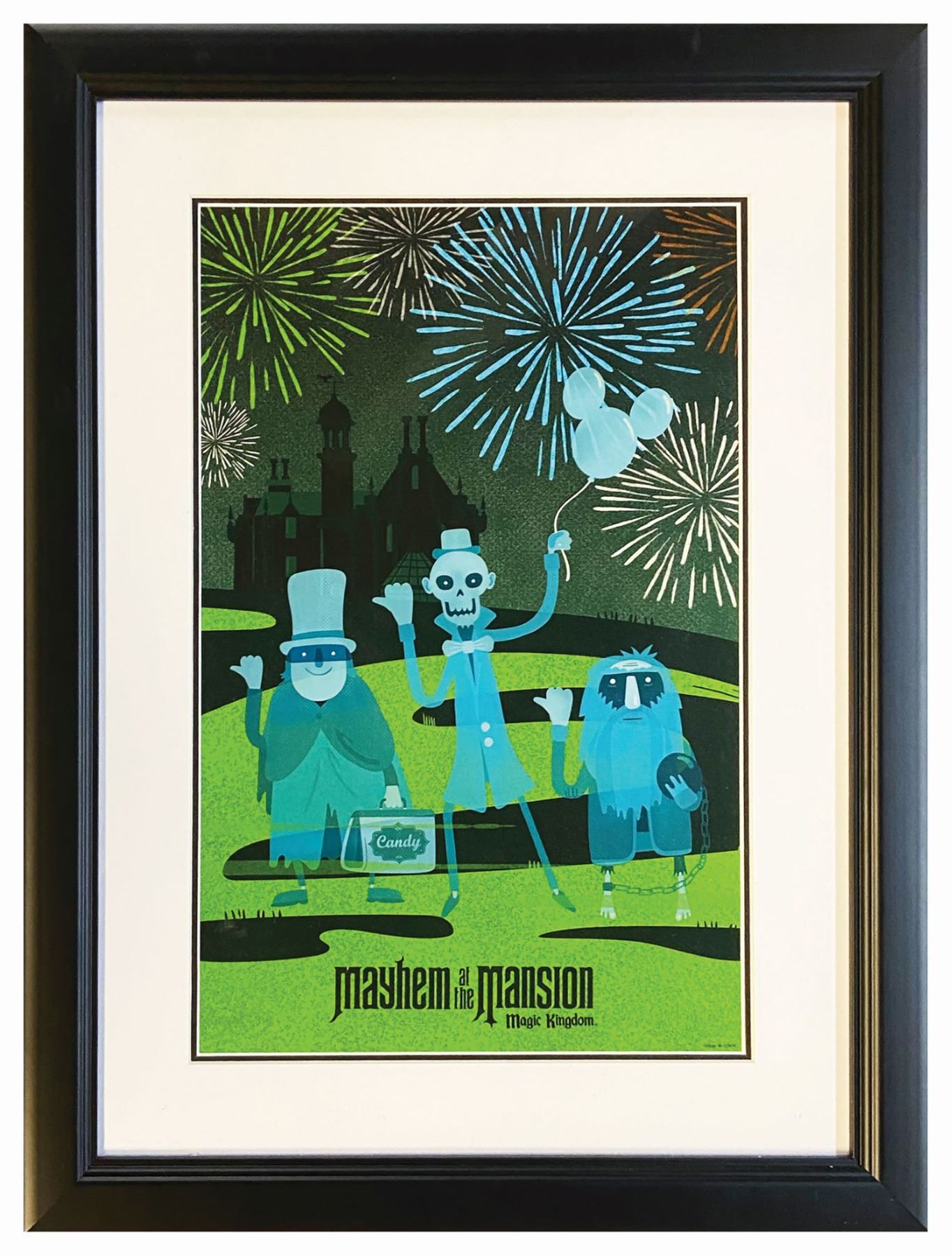 (Walt Disney World, 2014) A print celebrating "Mayhem at the Mansion," an augmented reality game app meant to be introduced for Mickey's Not-So-Scary Halloween Party. Ultimately, the app was pulled, but before that, this version of the hitchhiking ghosts could be seen when guests opened the app. The print measures 16.75"x10.5" in the 23.75"x17.75" frame and is in very good condition with minimal wear.