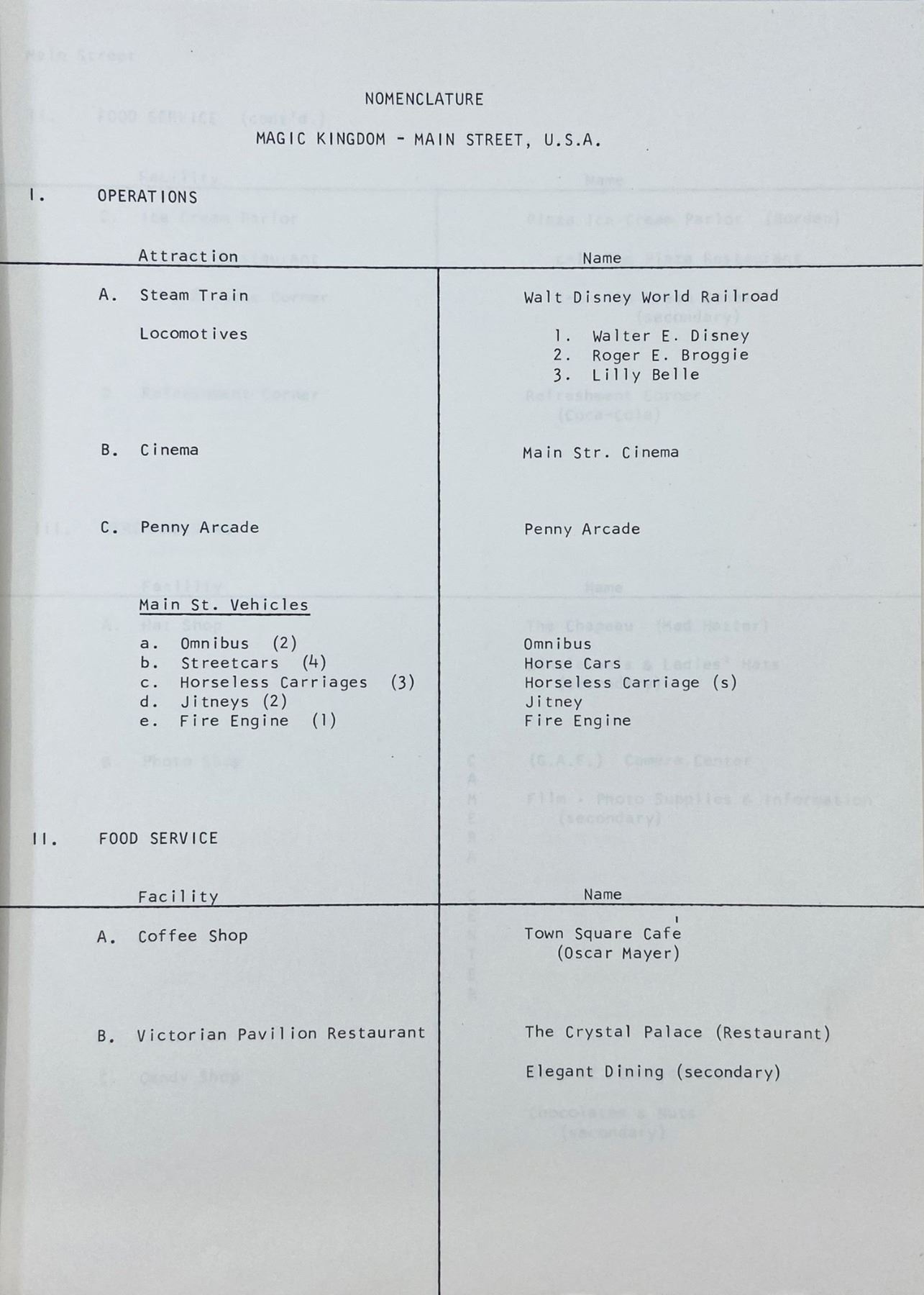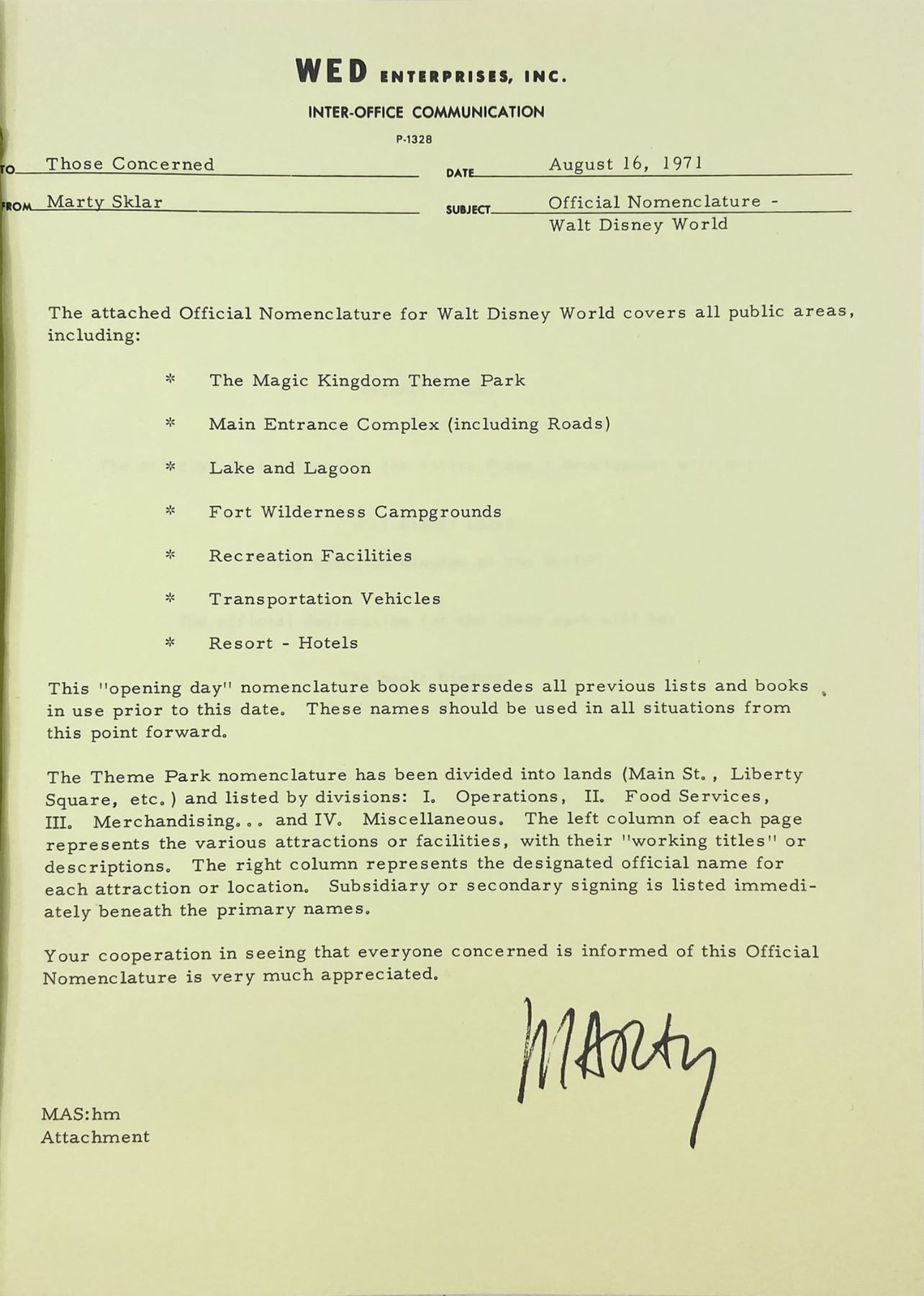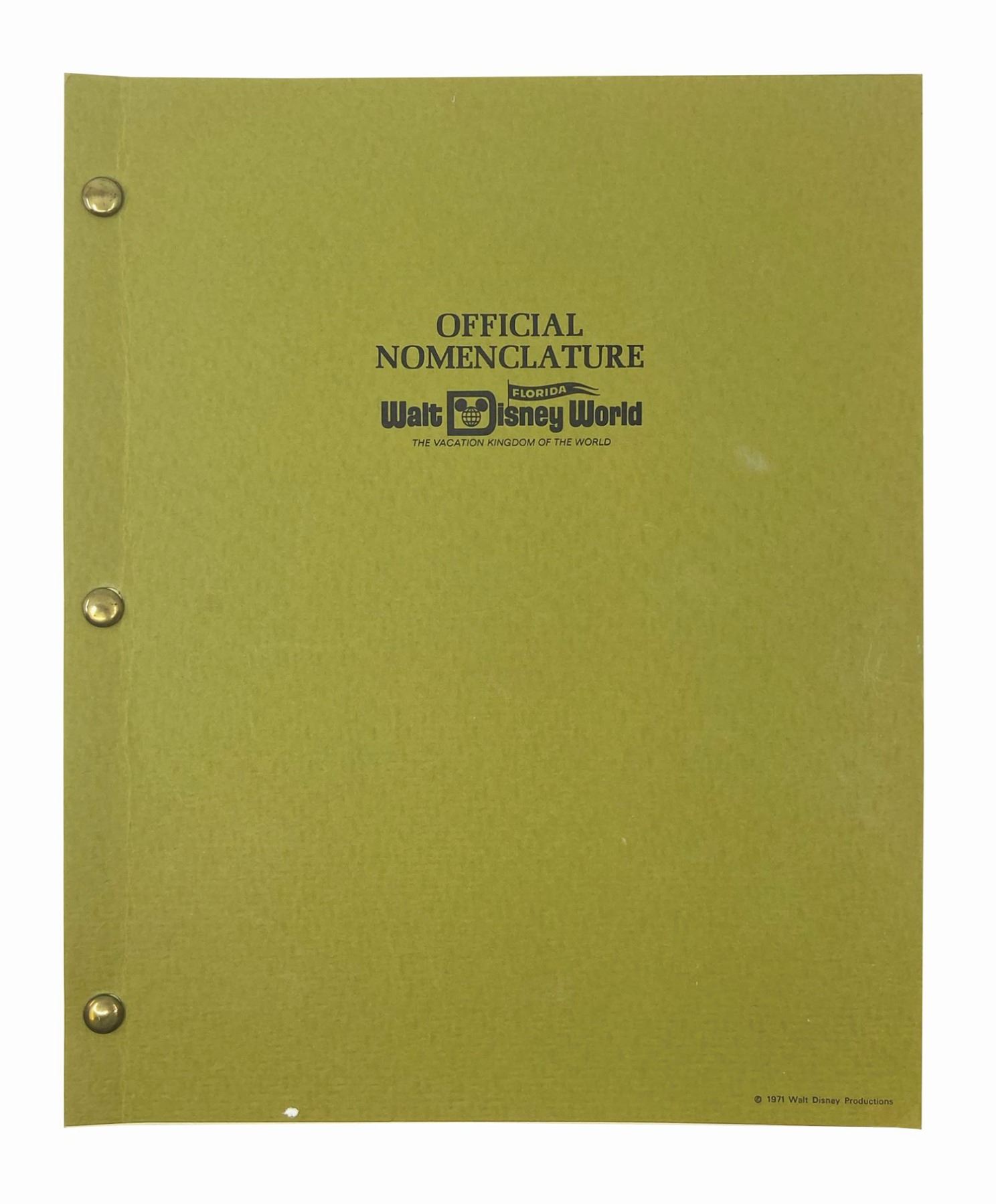 (Walt Disney World, 1971) An original pre-opening Walt Disney World nomenclature manual created for internal use by WED Imagineering employees. Created in August, prior to the October opening of Walt Disney World, this 44-page manual provides all the official terms for the attractions and entertainment in the various lands of the newest Disney Park. Measuring 11"x9", the manual is in good condition with some cover and edge-wear from use.