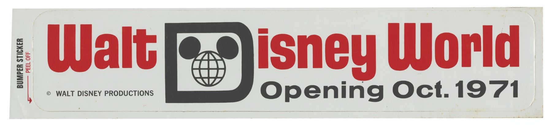 (Walt Disney World, c.1971) A rare bumper sticker created to promote the opening of Walt Disney World in October of 1971. The sticker measures approximately 3.25"x14.5" and is in very good condition with some minor peeling around the edges.