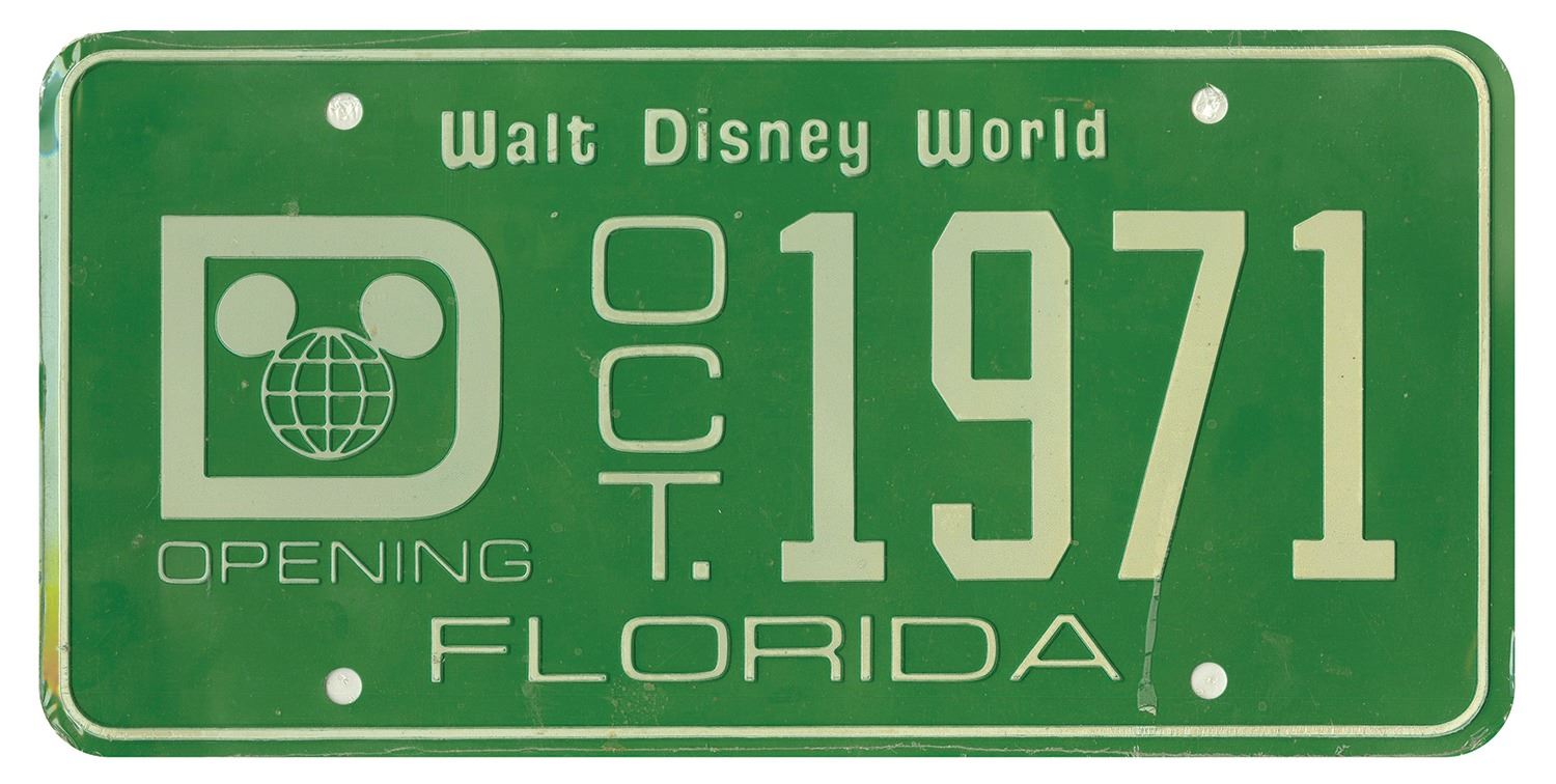 (Walt Disney World, 1971) An original souvenir license plate created to promote the opening of Walt Disney World in October of 1971. This green metal version replaced the earlier blue plates which were too similar to the actual 1970-71 Florida state license plates. Measuring 6"x12", this item is in fine condition and is still shrink wrapped in original plastic.