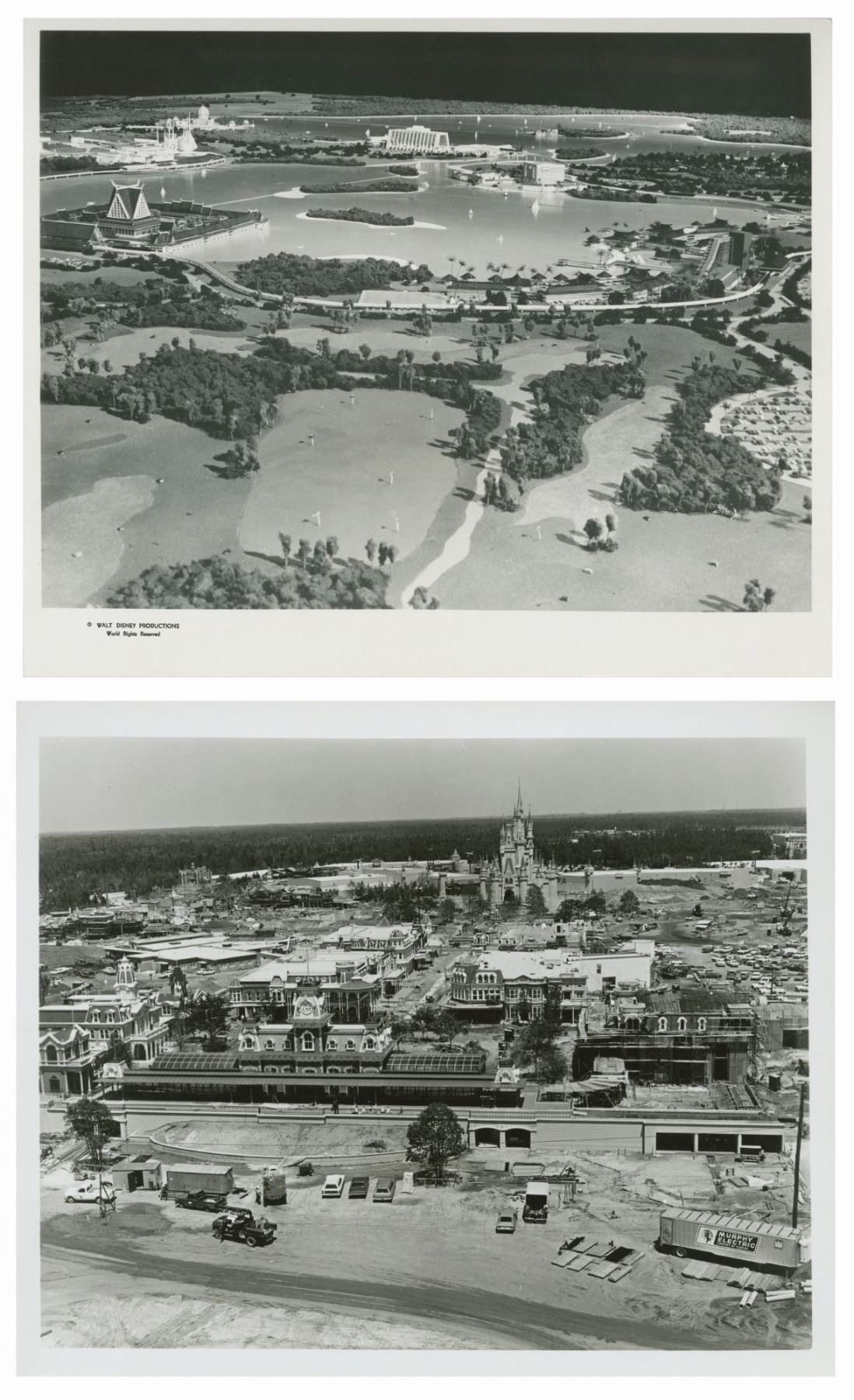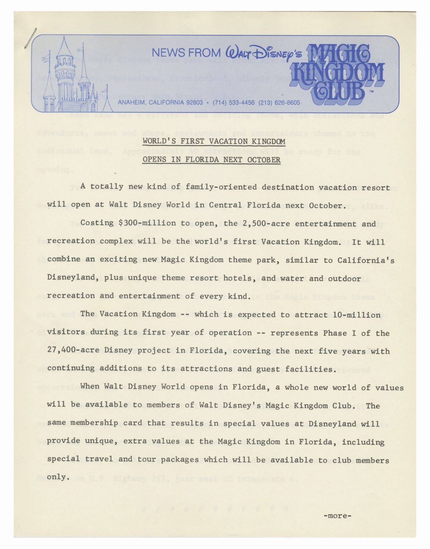 (Walt Disney World, 1971) An original press release from the Magic Kingdom Club that discusses the opening of Walt Disney World later that year. Along with the two sheets of typed information, two black and white photos are also included. These early documents and images show the construction of the park and a large model depicting details of the resort, such as the surrounding hotels and Monorail track. The typed sheets measure 11"x8.5" and the photos measure 8"x10". The set is in very good condition overall with minor handling wear.