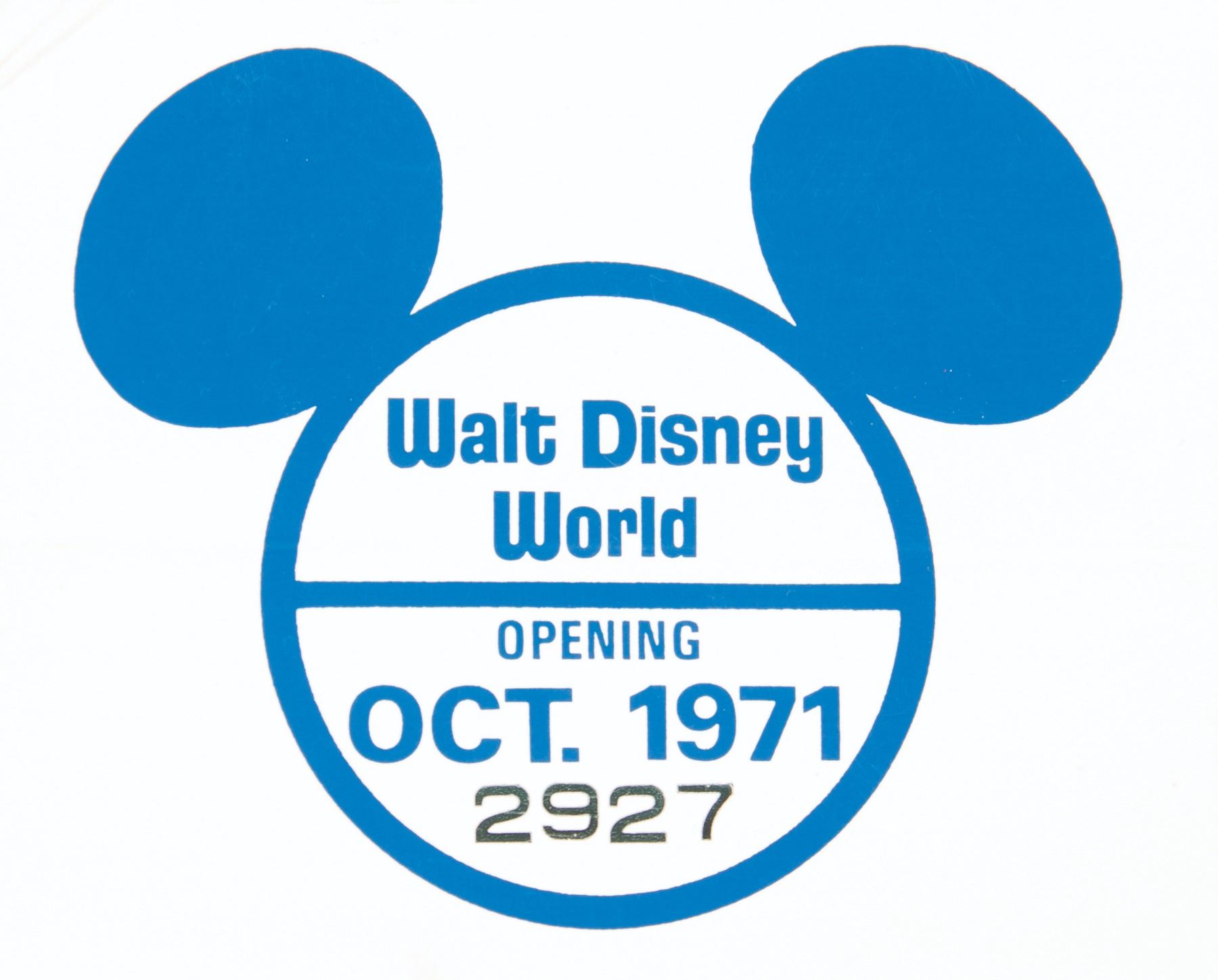 (Walt Disney World, 1971) A pre-opening sticker for Walt Disney World that features the opening date within a Mickey-ears logo. The sticker is numbered 2927 and was likely used by employees or visiting guests prior to October of 1971. The sticker is unused on its original backing and measures 3.25"x4". The condition is very good.