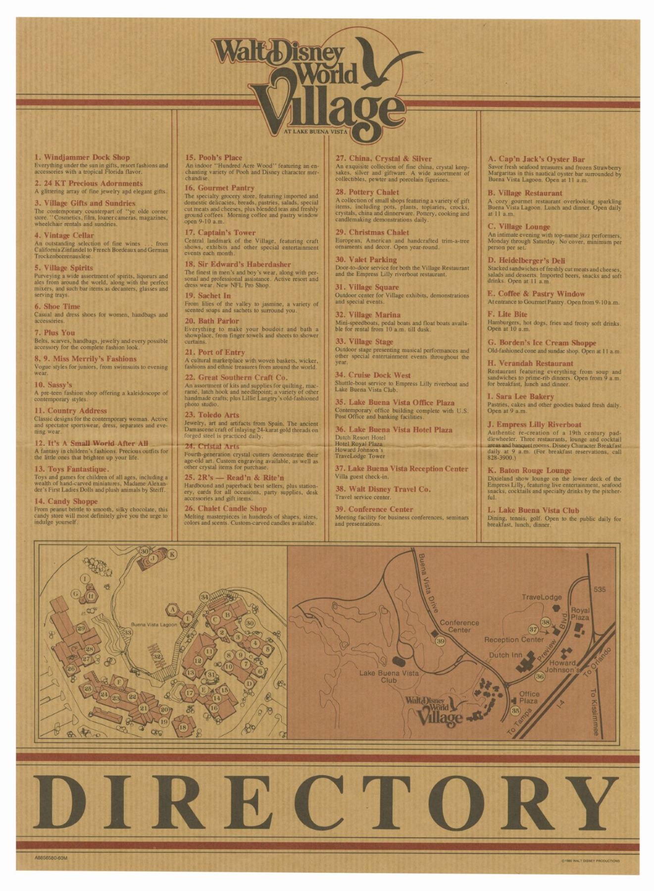 (Walt Disney World, 1980) A double-sided directory of Walt Disney World Village at Lake Buena Vista. One side features a welcome banner with brief descriptions of the entertainment, fine dining, and recreation options available at the Village. The reverse side features a comprehensive map, with a listing of stores and restaurants. This item measures 15"x11" and is in very good condition with minor wear.