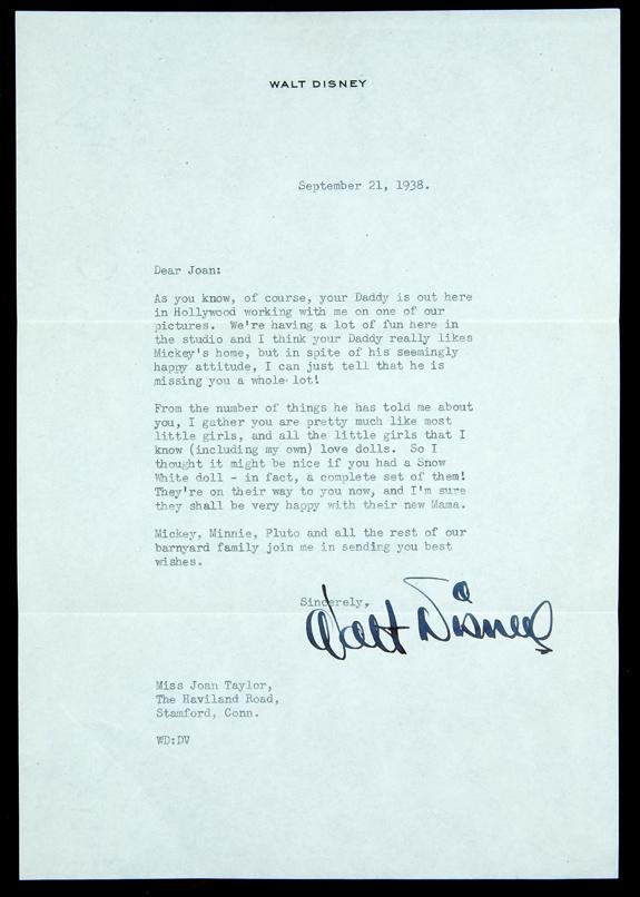 Walt Disney Writes A Tender Letter to Deems Taylor's Daughter. An extremely rare typed letter signed, one full page, on personal stationery, Sept. 21, 1938. Accompanied by the transmittal envelope. Fine condition with an exceptionally large, bold signature.