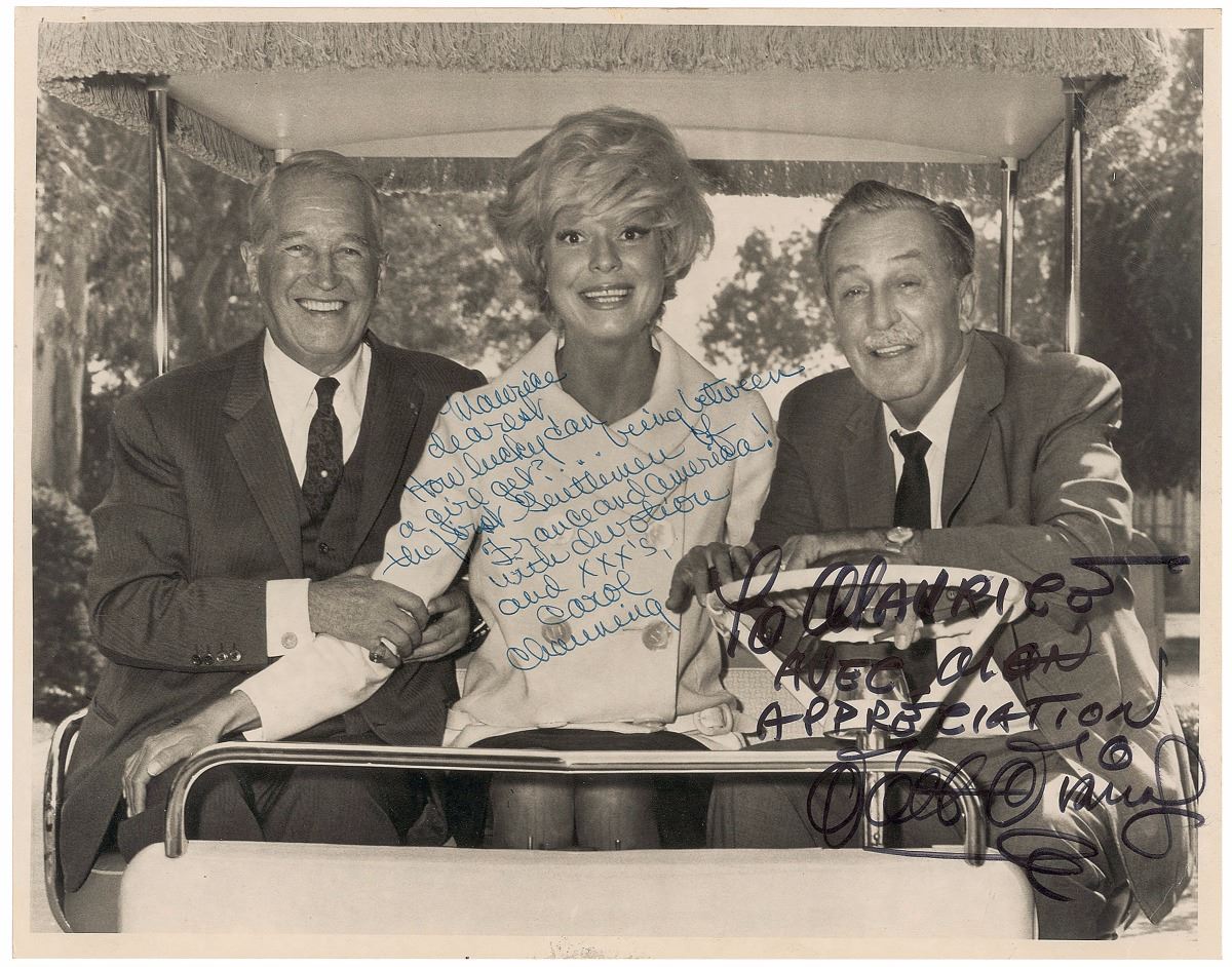 Unique matte-finish 14 x 11 photo of Disney and Channing with Maurice Chevalier, signed and inscribed in black felt tip, “To Maurice, avec mon appreciation, Walt Disney,” and in blue ballpoint, “Maurice dearest, How lucky can a girl get?…being between the first Gentlemen of France and America! With devotion and xxx’s, Carol Channing.” Diagonal creases to the upper right corner, staple holes and a crease to upper left, and some other trivial creases and soiling, otherwise fine condition. Although Chevalier did not appear in a Disney film until 1962—the live-action In Search of the Castaways—Disney had actually caricatured the French actor-singer in the 1933 Silly Symphonies episode 'Mickey's Gala Premiere.' An excellent association piece between entertainment icons.