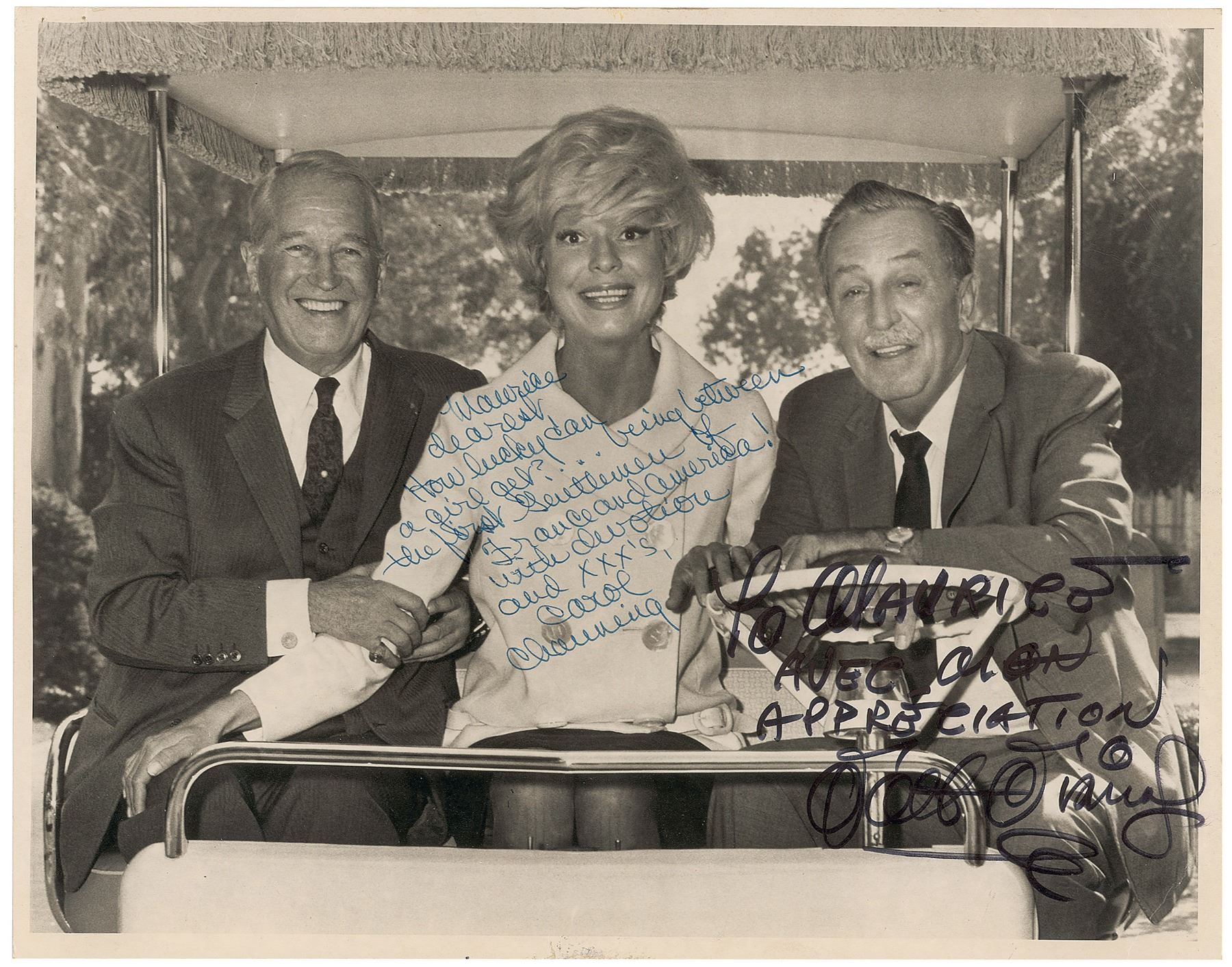 Unique matte-finish 14 x 11 photo of Disney and Channing with Maurice Chevalier, signed and inscribed in black felt tip, "To Maurice, avec mon appreciation, Walt Disney," and in blue ballpoint, "Maurice dearest, How lucky can a girl get?…being between the first Gentlemen of France and America! With devotion and xxx's, Carol Channing." In very good to fine condition, with creasing to the edges and corners, and staple holes to the upper left corner. Although Chevalier did not appear in a Disney film until 1962—the live-action In Search of the Castaways—Disney had actually caricatured the French actor-singer in the 1933 Silly Symphonies episode 'Mickey's Gala Premiere.' An excellent association piece between entertainment icons.