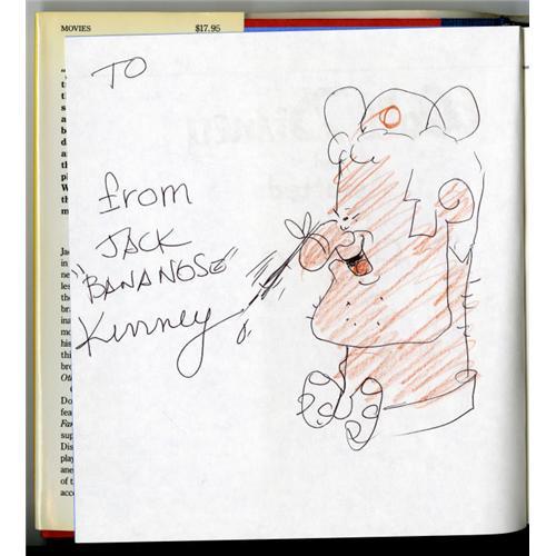 <B>"Walt Disney and Other Characters" Signed by Jack Kinney (Harmony Books, 1988).</B></I> First edition copy signed by author Jack Kinney and with a large original humorous colored pencil-and-ink self-portrait drawing opposite the title page. An extensively illustrated memoir by Kinney, who started working with Disney as an animator in 1931 on Mickey Mouse cartoons, and eventually had major production roles on Pinocchio, Dumbo, and Peter Pan. Both the book and the dust jacket are in Excellent condition. <BR><BR><B>Important notice:</B> Heritage usually auctions material at the rate of 200-250 lots per hour. On some occasions eBay Live bid software or the Internet may not be able to keep up with the pace of the auction. We recommend placing a realistic absentee bid now as insurance to avoid disappointment. Occasionally the auctioneer may eliminate or reject an eBay Live bid, and the auctioneer may also reopen a lot after the close of the eBay live bidding (usually because we missed an audience bid), and may reject your bid even if it shows you as the winning bidder. By bidding via eBay Live, you agree that Heritage may award the lot to another bidder at its sole discretion under the circumstances described above or any other reasonable circumstances. Since eBay bids are not shown to us until we open the lot on the floor, we treat those bids just like floor bids. In most cases the floor responds before the eBay bid is presented to us, due to Internet lag time, so for consistency we have made it a policy that floor bids are always considered first over tie eBay live bids. Also please note that all Heritage lots purchased through eBay Live carry a 22.5% Buyer's Premium. Please make sure you read the Terms and Conditions before you bid. This lot is being auctioned in conjunction with a live floor auction by Heritage Auction Galleries. All final auction and invoice information will be supplied by Heritage Auction Galleries, and all other information should be considered preliminary. Lot:41001 <BR><BR><B>Winning Notification and Billing:</B> After the FINAL session in this auction is complete, Heritage will send e-mail and snail mail invoices. This process normally takes several days. All final auction and invoice information will be supplied by Heritage Auction Galleries, and all other information should be considered preliminary. <BR><BR>This auction will be conducted on a live auction floor and over the Internet through eBay Live. If you choose to place an absentee bid, please take a moment to <font color='#0000ff'><u><a href='http://pages.ebay.com/liveauctions/help/before/laabsentee.html'>learn how eBay Live absentee bidding works</a></u></font><font color='#000000'>