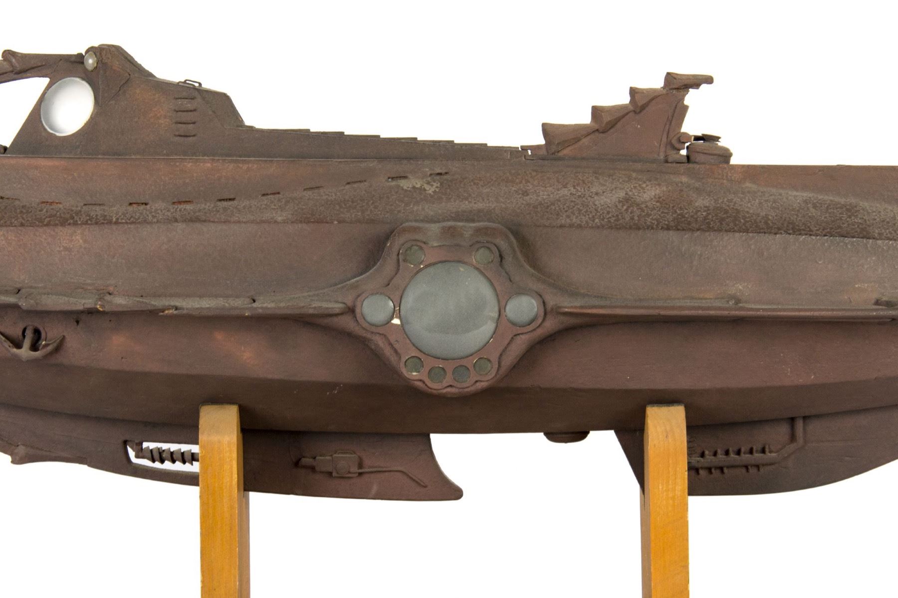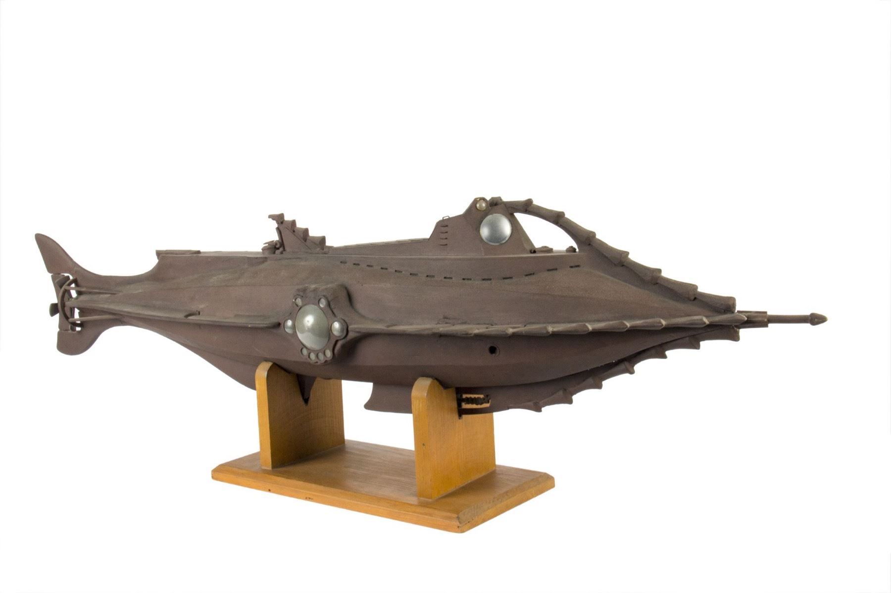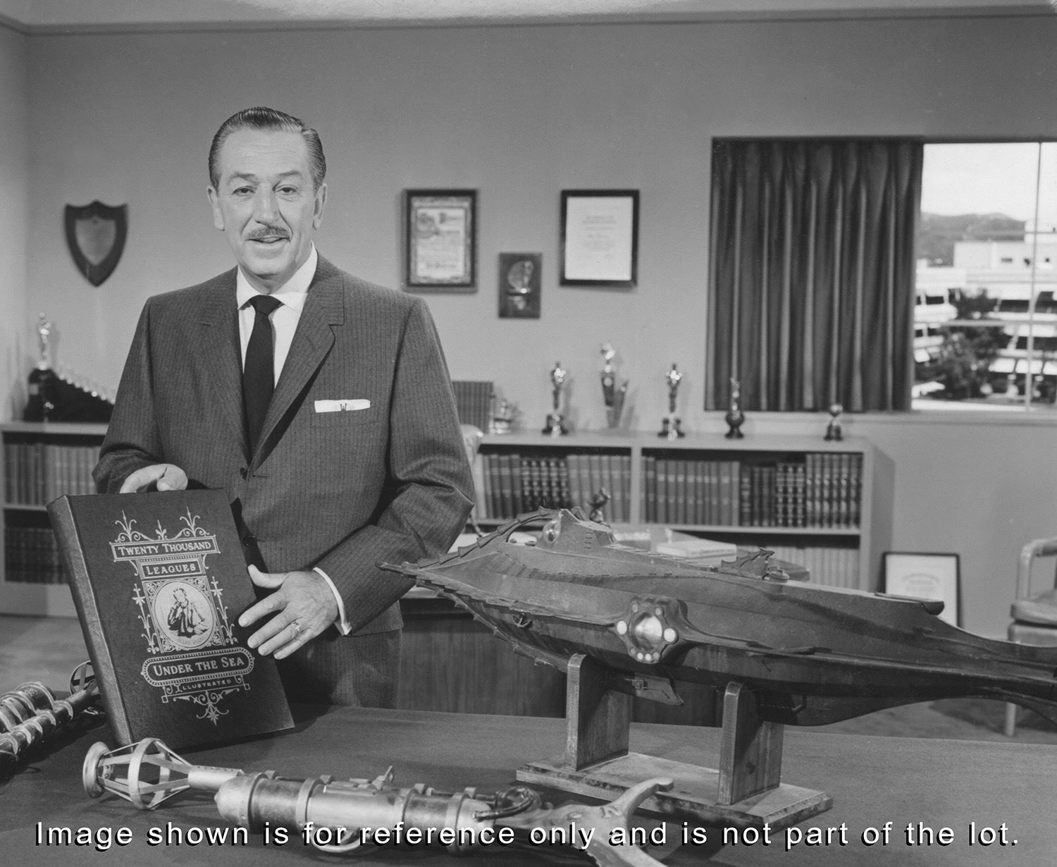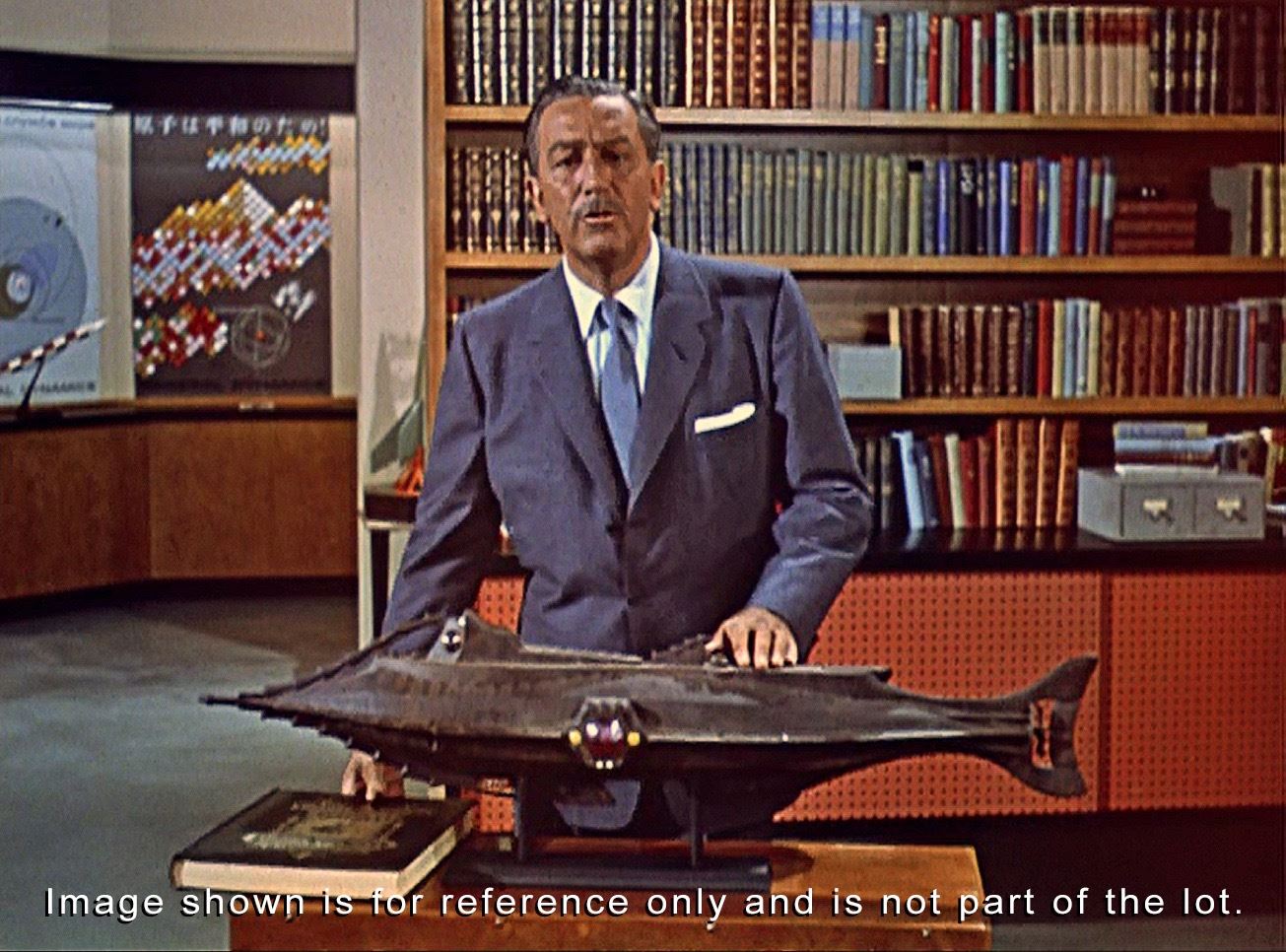 (Disney, c.1954) This is the original wooden Nautilus model used by Walt Disney to promote the feature film "20,000 Leagues Under the Sea". The model can be seen with Walt Disney in the 1954 episode of the Disneyland television show "Operation Undersea", as well as the 1957 episode "Our Friend the Atom". When it came time for Walt Disney to introduce the Nautilus to general audiences prior to the theatrical release of the film, it was this model that Walt selected as his focal point. Constructed by hand in wood, this large Nautilus model beautifully captures the essence of the iconic feature film. Measuring approximately 44" long and displayed on a custom-built stand for the model's protection, this incredible artifact is in good condition overall with wear throughout from use. At some point after the model's initial use, the Nautilus was partially damaged leaving a few thin cracks, dings, or small breaks, and a few small areas were replaced including the ram, dorsal fin, propeller, and lenses. It is believed that once these areas were replaced, the model received a new coat of paint so that all of the areas would better match in color. However, some of the original lighter streaks of brown can be seen in areas of the model that match the coat of paint as seen in the 1950s films. Additionally, since many parts of the Nautilus were hand-carved and hand-tooled, they are unique in size and shape. These areas, such as the raker teeth on the sides and front of the model, can be easily matched to the vintage photos of Walt Disney with this exact model. This Nautilus is an incredible artifact in the creation and history of "20,000 Leagues Under the Sea", having been personally handled and used by Walt Disney himself.