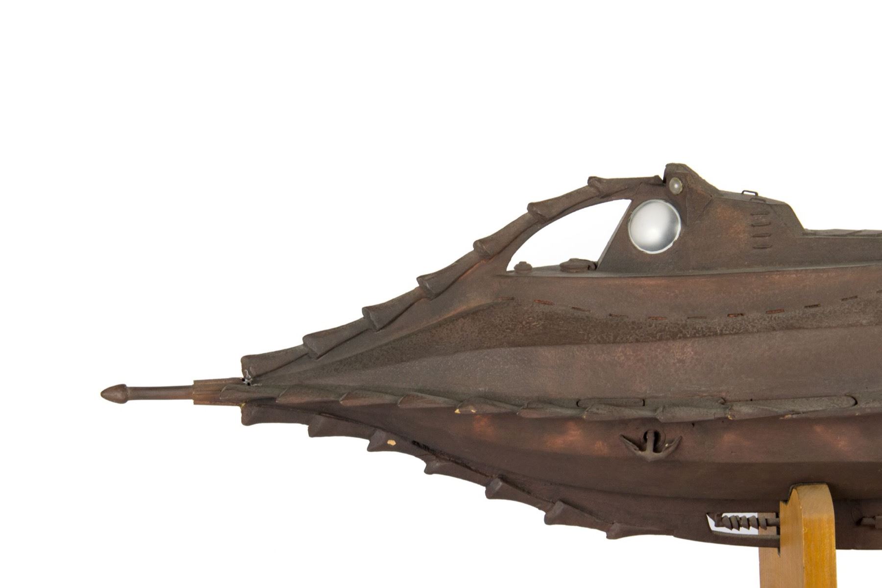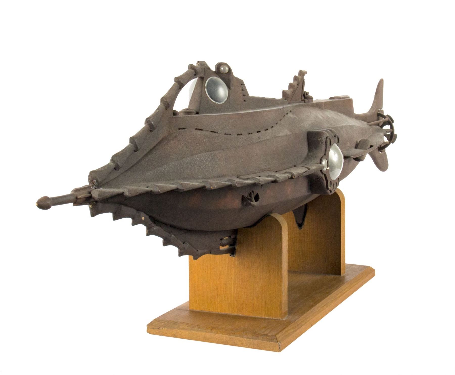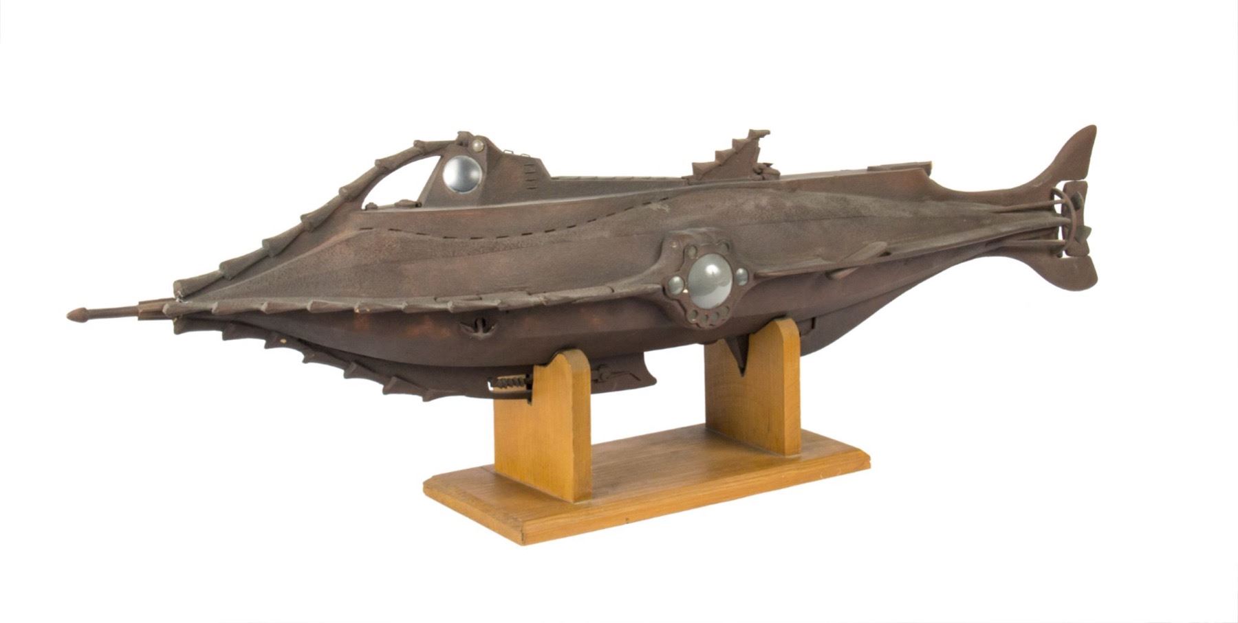 (Disney, c.1954) This is the original wooden Nautilus model used by Walt Disney to promote the feature film "20,000 Leagues Under the Sea". The model can be seen with Walt Disney in the 1954 episode of the Disneyland television show "Operation Undersea", as well as the 1957 episode "Our Friend the Atom". When it came time for Walt Disney to introduce the Nautilus to general audiences prior to the theatrical release of the film, it was this model that Walt selected as his focal point. Constructed by hand in wood, this large Nautilus model beautifully captures the essence of the iconic feature film. Measuring approximately 44" long and displayed on a custom-built stand for the model's protection, this incredible artifact is in good condition overall with wear throughout from use. At some point after the model's initial use, the Nautilus was partially damaged leaving a few thin cracks, dings, or small breaks, and a few small areas were replaced including the ram, dorsal fin, propeller, and lenses. It is believed that once these areas were replaced, the model received a new coat of paint so that all of the areas would better match in color. However, some of the original lighter streaks of brown can be seen in areas of the model that match the coat of paint as seen in the 1950s films. Additionally, since many parts of the Nautilus were hand-carved and hand-tooled, they are unique in size and shape. These areas, such as the raker teeth on the sides and front of the model, can be easily matched to the vintage photos of Walt Disney with this exact model. This Nautilus is an incredible artifact in the creation and history of "20,000 Leagues Under the Sea", having been personally handled and used by Walt Disney himself.