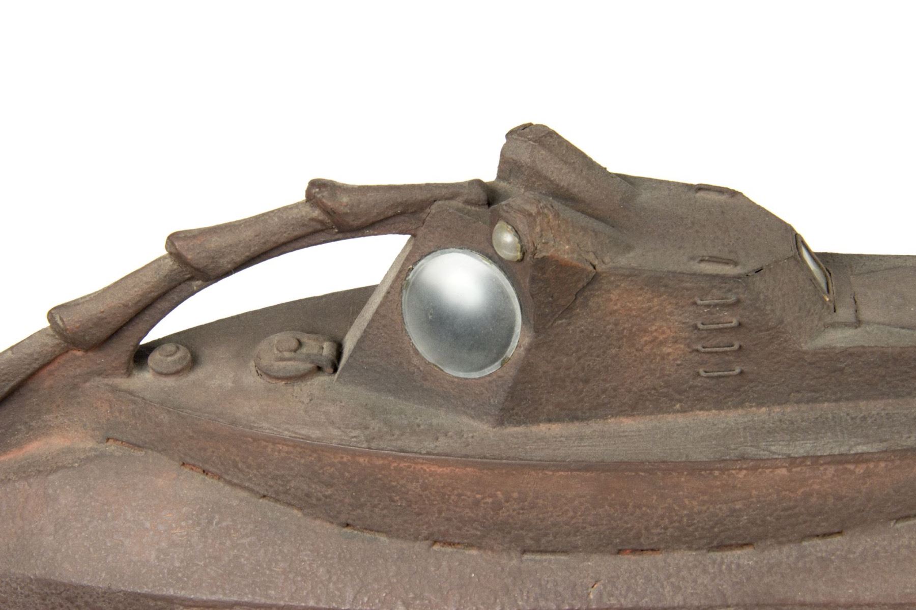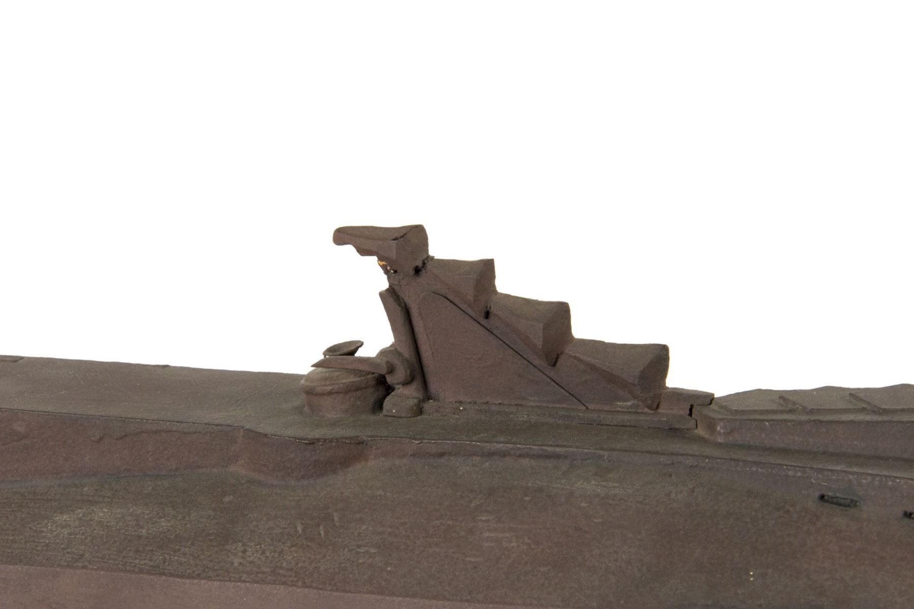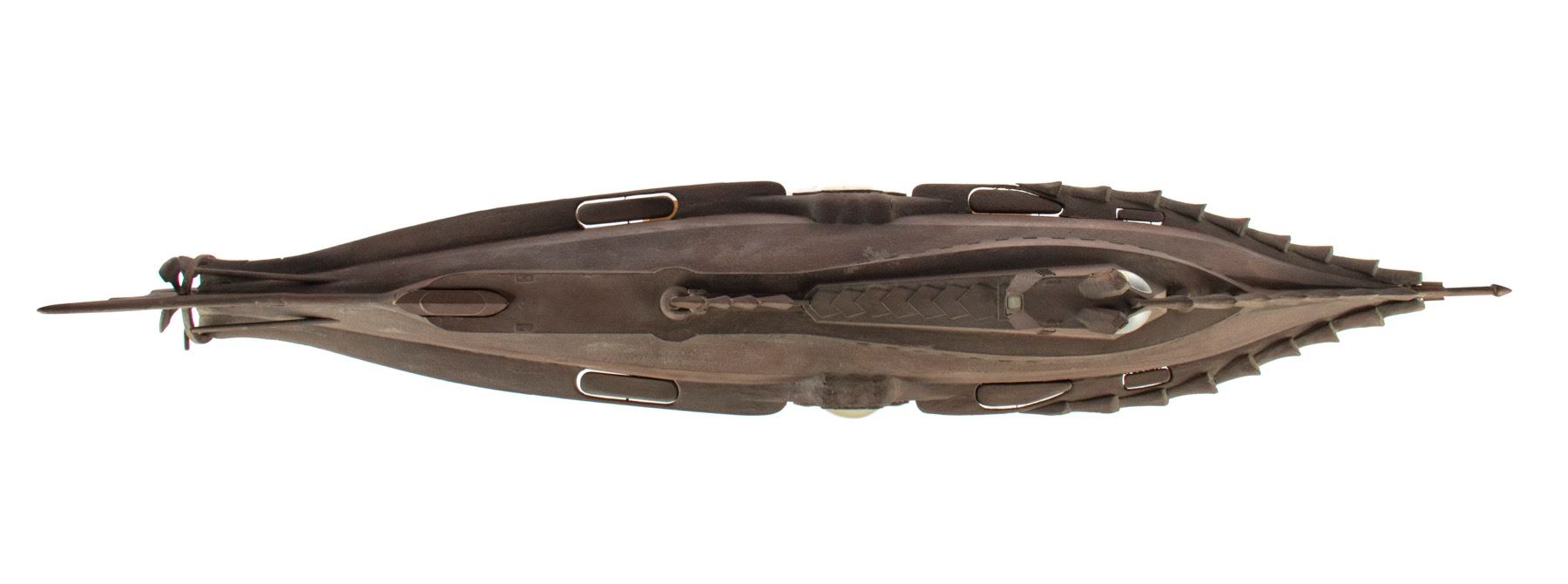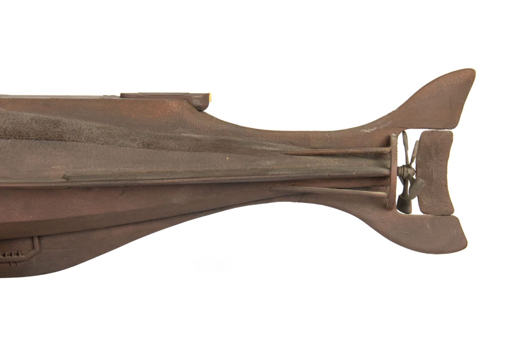 (Disney, c.1954) This is the original wooden Nautilus model used by Walt Disney to promote the feature film "20,000 Leagues Under the Sea". The model can be seen with Walt Disney in the 1954 episode of the Disneyland television show "Operation Undersea", as well as the 1957 episode "Our Friend the Atom". When it came time for Walt Disney to introduce the Nautilus to general audiences prior to the theatrical release of the film, it was this model that Walt selected as his focal point. Constructed by hand in wood, this large Nautilus model beautifully captures the essence of the iconic feature film. Measuring approximately 44" long and displayed on a custom-built stand for the model's protection, this incredible artifact is in good condition overall with wear throughout from use. At some point after the model's initial use, the Nautilus was partially damaged leaving a few thin cracks, dings, or small breaks, and a few small areas were replaced including the ram, dorsal fin, propeller, and lenses. It is believed that once these areas were replaced, the model received a new coat of paint so that all of the areas would better match in color. However, some of the original lighter streaks of brown can be seen in areas of the model that match the coat of paint as seen in the 1950s films. Additionally, since many parts of the Nautilus were hand-carved and hand-tooled, they are unique in size and shape. These areas, such as the raker teeth on the sides and front of the model, can be easily matched to the vintage photos of Walt Disney with this exact model. This Nautilus is an incredible artifact in the creation and history of "20,000 Leagues Under the Sea", having been personally handled and used by Walt Disney himself.