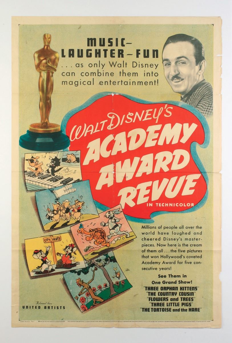 (Walt Disney Studios, 1937) Original release one-sheet movie poster for "Walt Disney's Academy Award Revue", a feature length compilation of Disney's Academy Award winning shorts. Measures 27"x41". The poster is in good condition with edge wear and creases.